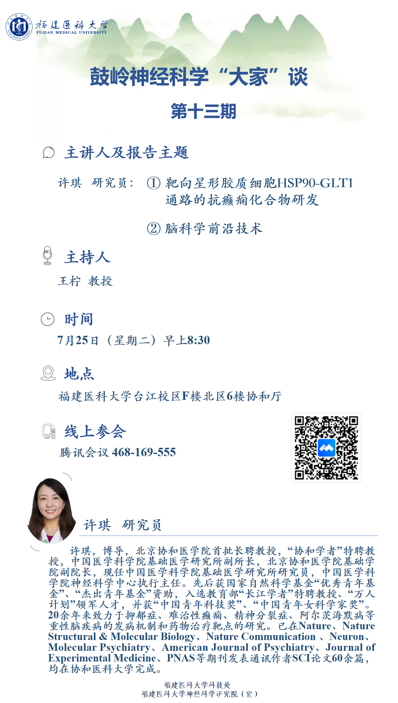 为了进一步提升我校的学术声誉和学科知名度,加强国际和国内同行间的交流与合作,同时以神经科学带动多学科协同发展,共同加快推进我校的“双一流”建设。我校采取“请进来”“走出去”相结合的模式,举办鼓岭神经科学“大家”谈系列学术讲座,定期邀请国内外知名专家以及本校学者开展高水平学术讲座。第十三期我们再次邀请了中国医学科学院许琪教授于2023年7月25日举办讲座以及线下交流,欢迎大家积极参会!