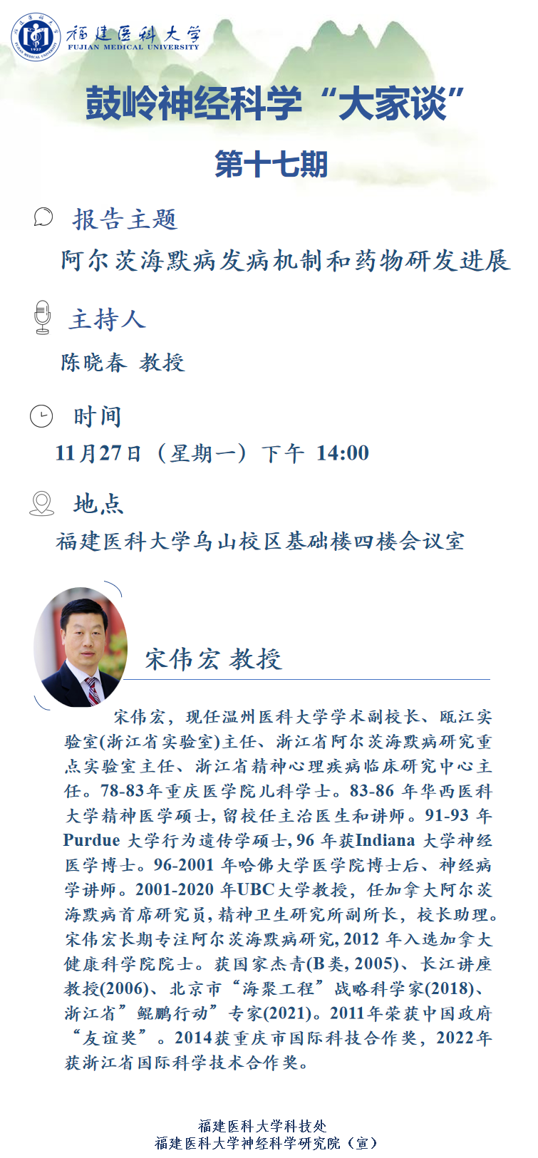 为了进一步提升我校的学术声誉和学科知名度,加强国际和国内同行间的交流与合作,同时以神经科学带动多学科协同发展,共同加快推进我校的“双一流”建设。我校采取“请进来”“走出去”相结合的模式,举办鼓岭神经科学“大家”谈系列学术讲座,定期邀请国内外知名专家以及本校学者开展高水平学术讲座。第十七期我们邀请了温州医科大学宋伟宏教授于2023年11月27日举办讲座,欢迎大家积极参会!