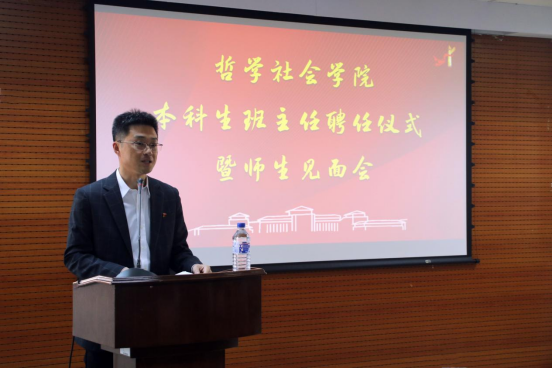 首先,刘培强老师宣读聘任决定,聘任王哲夫老师为哲学社会学院2021级社会学类2班班主任,党委书记李佰志老师为王哲夫老师颁发了聘书。