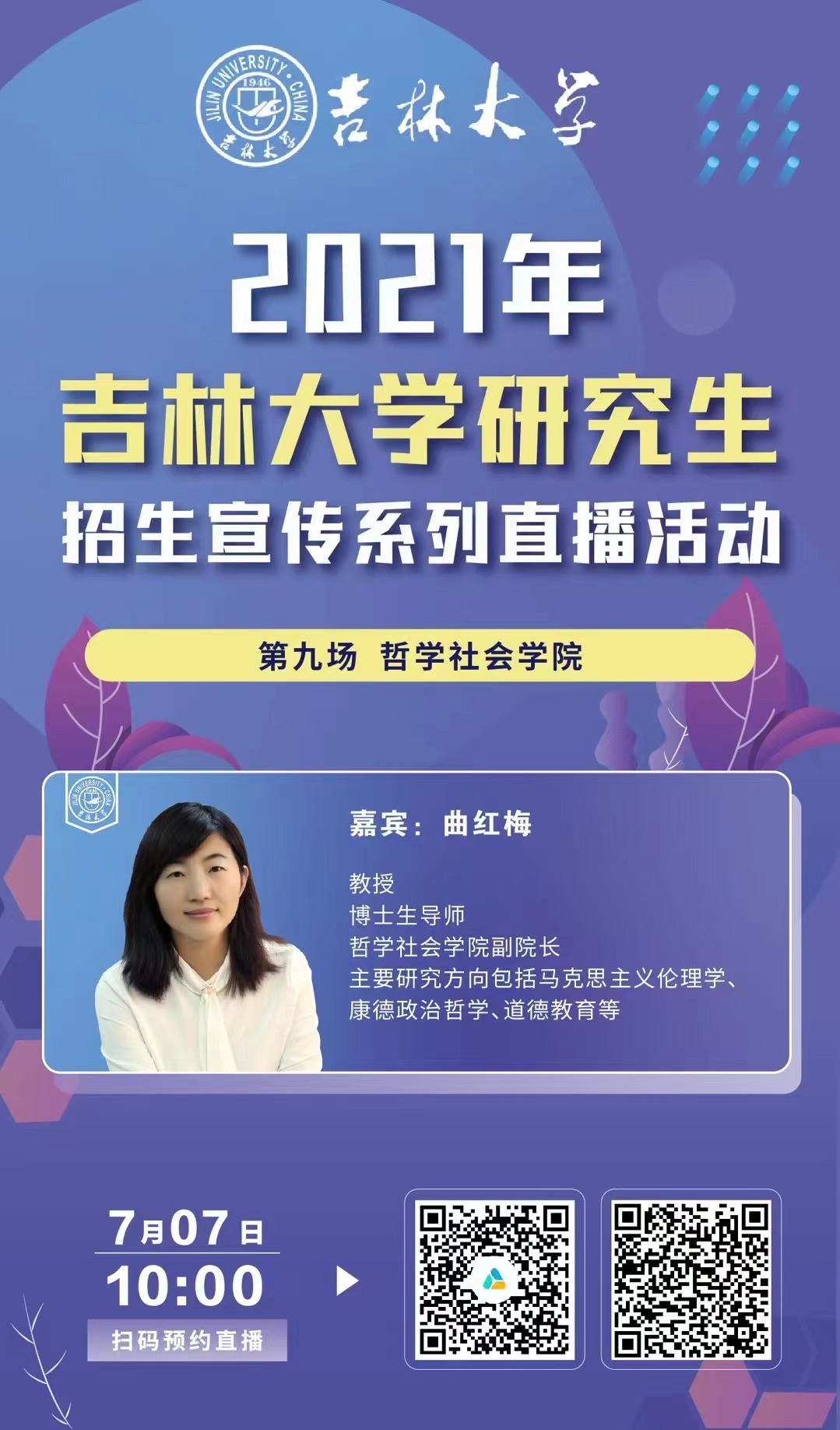 2021年7月7日,哲学社会学院副院长曲红梅教授在腾讯云课堂开展“研招直播”活动,面向全网高校师生进行招生宣传。曲红梅教授在直播中详细介绍了哲学社会学院基本情况和专业设置,并根据研究方向着重介绍了哲学系学科优势,使观看直播的高校负责人和学生对学院和专业有了深入了解,也为考生提供更便捷的信息服务,提升和扩大了我院的影响力。