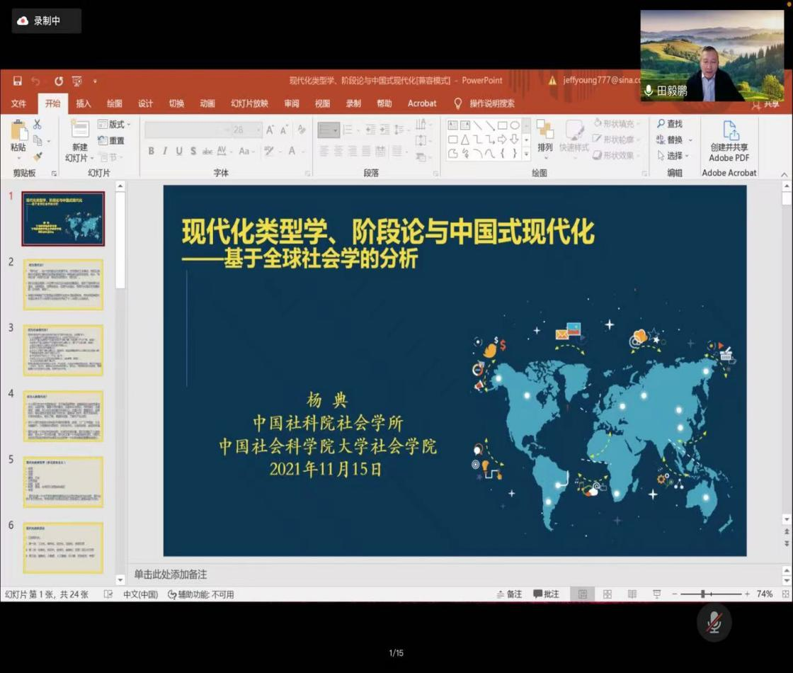2021年11月15日,“哲学社会学院名家系列”讲座第149场——《现代化类型学、阶段论与中国式现代化:基于全球社会学的分析》,以线上会议的方式成功举行。主讲人为杨典研究员,哈佛大学社会学博士、中国社会科学院社会学所副所长、中国社会科学院大学社会学院副院长。本次讲座由田毅鹏院长主持,我院100余名同学线上参加了此次会议。