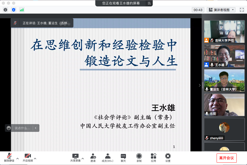 2021年11月13日上午9:30,哲学社会学院第148场名家讲座通过腾讯会议的形式在线上举办。中国人民大学社会学理论与方法研究中心、社会与人口学院教授、博士生导师王水雄教授,为线上百余名师生带来题为《在思维创新和经验检验中锻造论文与人生》的学术讲座。社会学系主任董运生教授主持本场讲座。