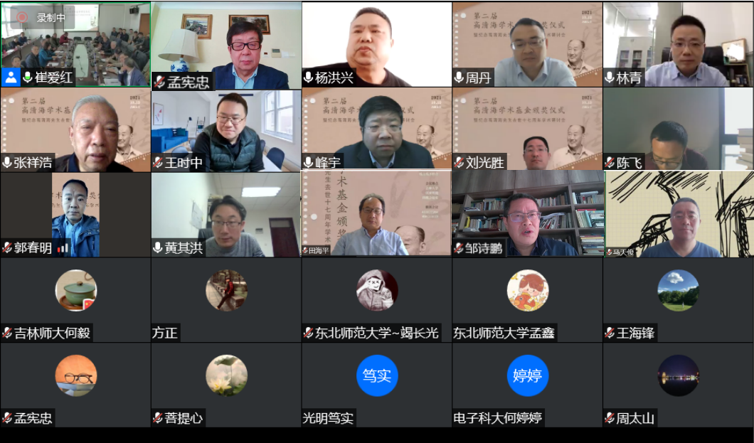 高清海先生是当代中国著名哲学家、教育家。先生一生爱智求真,为繁荣和发展我国的哲学事业做出了重要贡献。2019年,为了传承高清海哲学思想,弘扬高清海哲学创新精神,推进哲学基础理论研究,国内学术界同仁、广大系友和高清海弟子发起并捐资筹建了“高清海学术基金”。基金面向全国哲学界,奖励高清海哲学思想研究和外译的优秀成果以及哲学基础理论研究的优秀创新性成果。今年是第二次评奖,来自东南大学、中国人民大学、南开大学、吉林大学、复旦大学、中国社会科学院哲学研究所、中国孔子研究院等高校和研究院所的十二名学者获得奖励。在颁奖仪式上,崔月琴教授宣布了第二届高清海学术基金奖获奖者名单,吉林大学哲学社会学院院长田毅鹏教授为大会致辞。东南大学张祥浩教授教授、中国人民大学臧峰宇教授和中国社会科学院周丹研究员在线上代表获奖者先后发言。