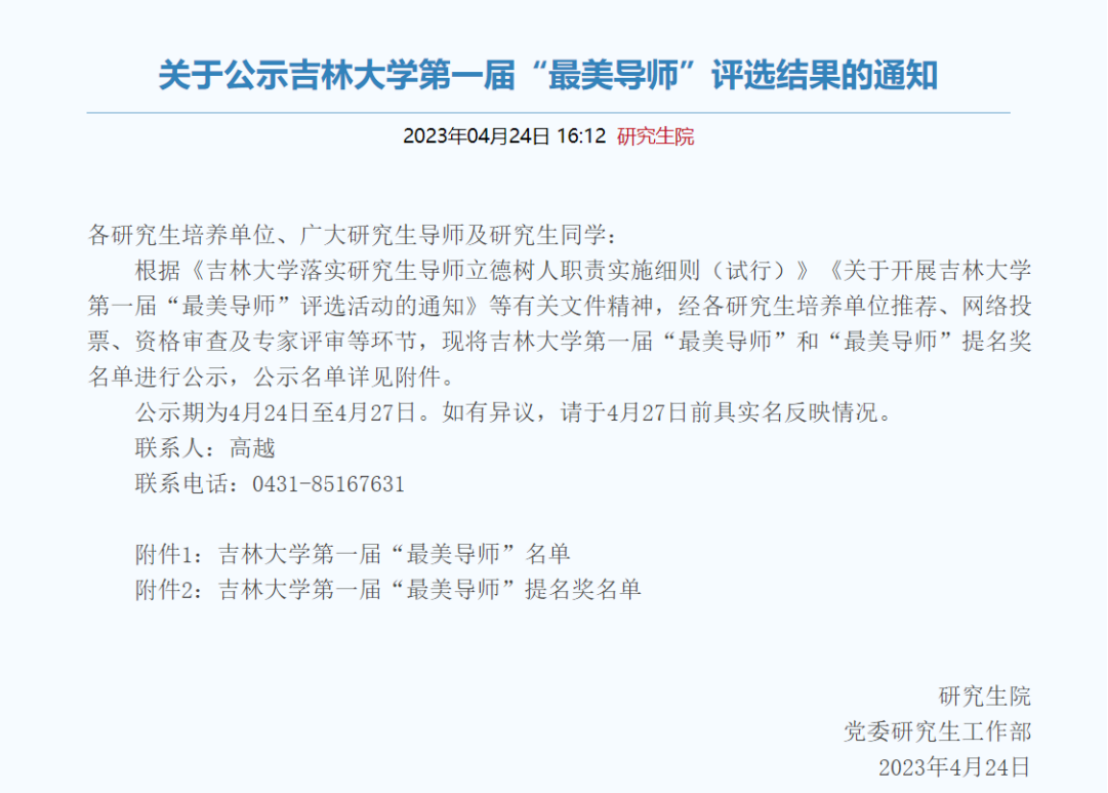 根据《吉林大学落实研究生导师立德树人职责实施细则(试行)》《关于开展吉林大学第一届“最美导师”评选活动的通知》等有关文件精神,经各研究生培养单位推荐、网络投票、资格审查及专家评审等环节,拟定20位教师获吉林大学第一届“最美导师”、“最美导师”提名奖。