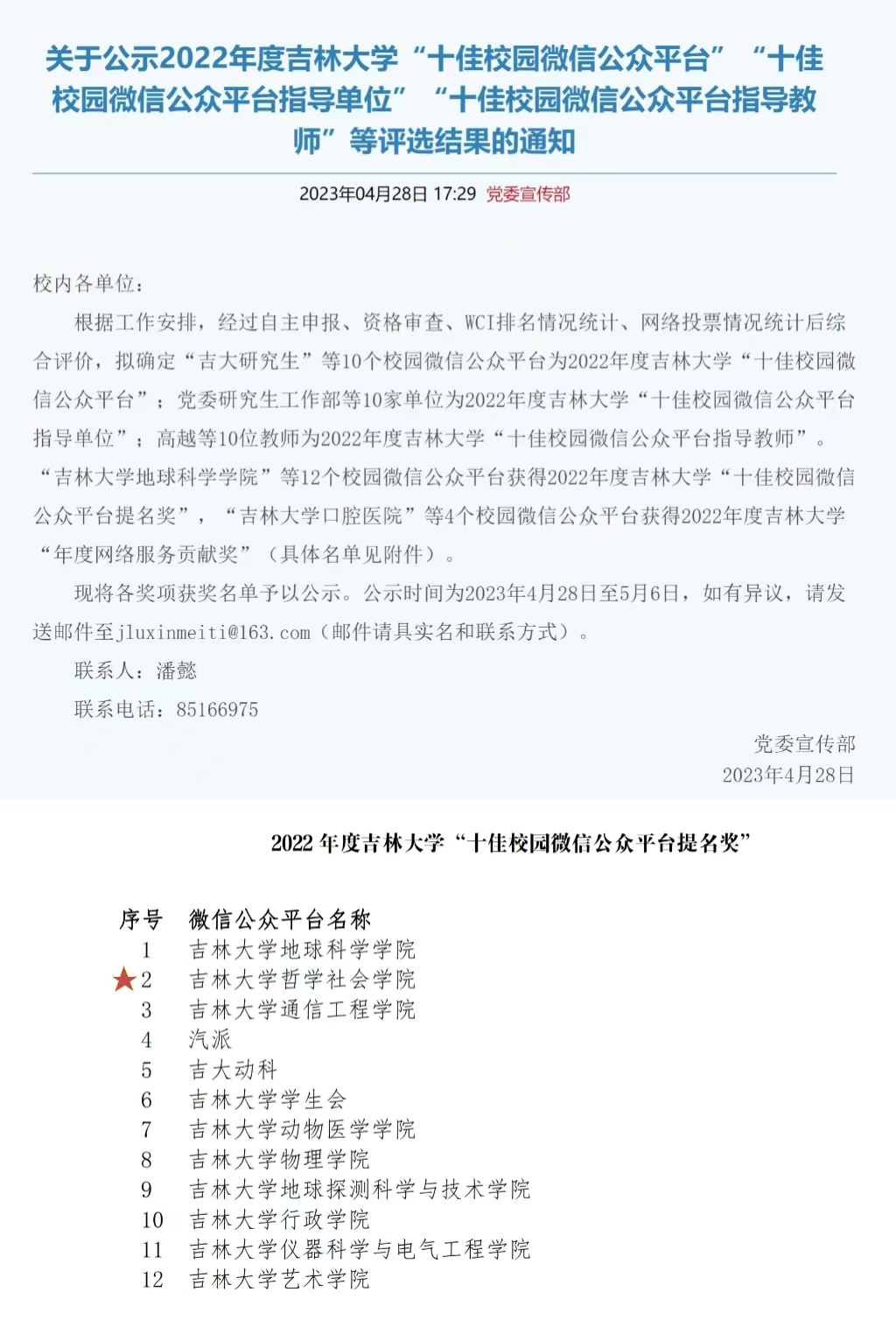 日前,根据有关工作安排,经过自主申报、资格审查、WCI排名情况统计、网络投票情况统计后综合评价,我院微信公众号“吉林大学哲学社会学院”荣获2022年度吉林大学“十佳校园微信公众平台提名奖”,这也是我院微信公众号首次入围吉林大学“十佳校园微信公众平台”评选活动。