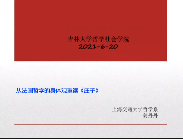 2021年6月20日星期日下午一点半至四点,“吉林大学哲学社会学院名家系列讲座第134场”在东荣大厦顺利举行。本次讲座的主题为“从法国哲学身体观的视角重读《庄子》”,主讲人为上海交通大学人文学院博士生导师,欧洲文化高等研究院研究员,国际哲学学院(CIPh巴黎)终身通信研究员、国外科研项目主任、学术委员会成员、中国区代表之一的姜丹丹教授。姜丹丹教授亦是国际哲学学院知名哲学杂志《笛卡尔街》的国际编委,国内知名丛书“轻与重”文丛的主编,近年来一直致力于中法哲学跨文化对话研究。本次讲座同时邀请了哲学社会学院副院长、马克思主义学者王福生教授,中国哲学学者刘连朋副教授,西方哲学学者龙晶副教授作为与谈嘉宾,三位学者都具有深厚的中西汇通的涵养与视野,与姜丹丹教授进行了一场精采的跨文化、跨学科的交流与对话。赵雄峰老师主持了本次讲座。