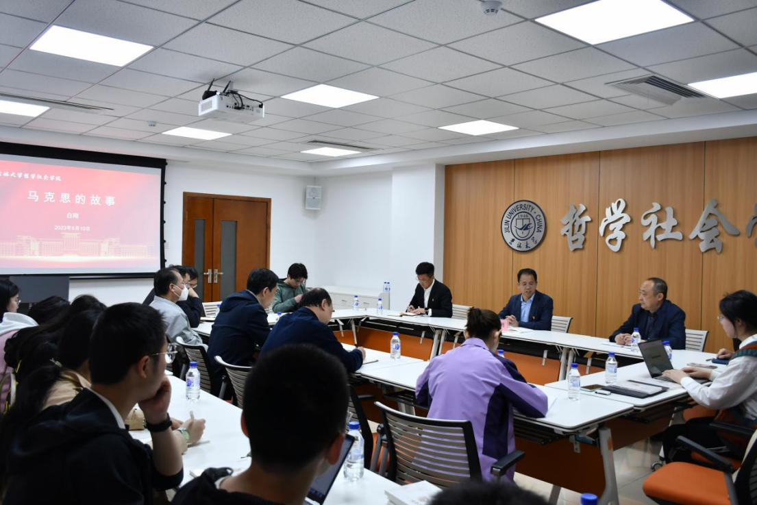 为深入开展学习贯彻习近平新时代中国特色社会主义思想主题教育,坚持学思用贯通、知信行统一,把习近平新时代中国特色社会主义思想转化为坚定理想、锤炼党性和指导实践、推动工作的强大力量,5月10日在东荣大厦915会议室,哲学社会学院院长白刚教授结合《马克思的故事》一书做专题讲授和辅导。哲学社会学院党委理论学习中心组全体成员、哲学专业本科生党支部全体党员参加学习。活动由学院党委副书记兼副院长、学院主题教育领导小组办公室主任、哲学专业本科生党支部书记刘培强主持。