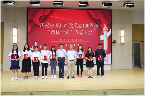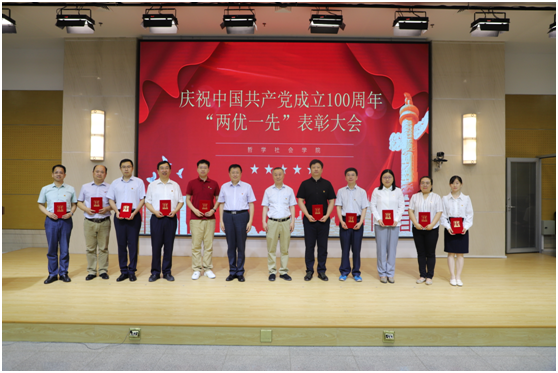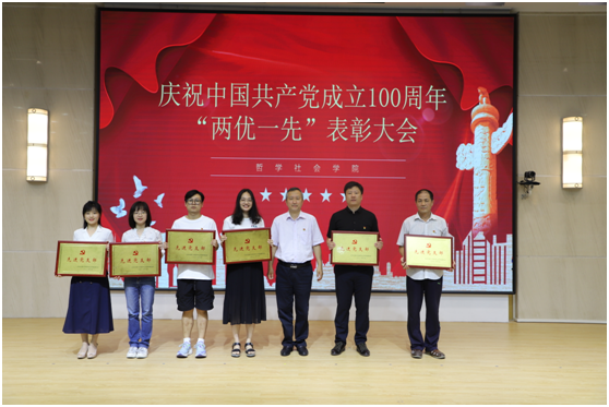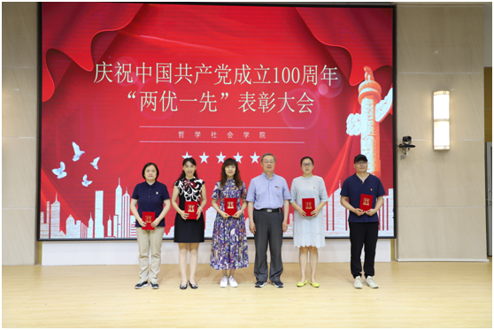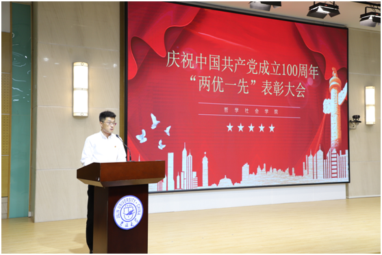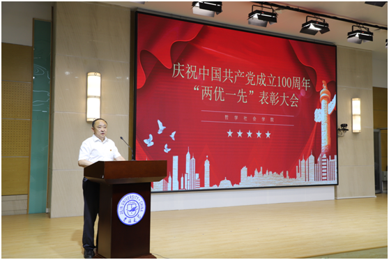 为庆祝中国共产党成立100周年,表彰先进、激发斗志、凝聚力量,2021年6月30日哲学社会学院在东荣会议中心隆重举行庆祝中国共产党成立100周年“两优一先”表彰大会。学院党委委员、纪委委员、全体教职工党员和部分学生党员代表参加会议,会议由学院党委副书记兼副院长刘培强主持。