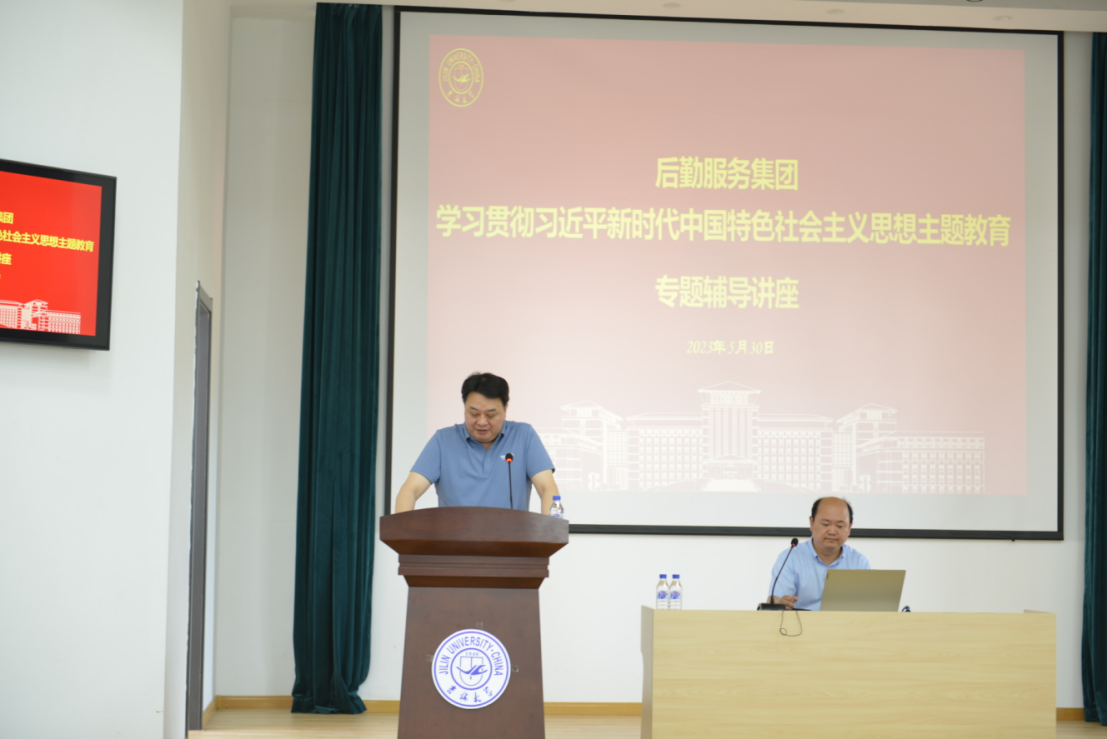 为深入学习贯彻习近平新时代中国特色社会主义思想,推动主题教育走深走实,2023年5月30日,后勤服务集团召开党委理论学习中心组(扩大)集体学习暨学习贯彻习近平新时代中国特色社会主义思想主题教育读书班辅导报告会。邀请吉林大学学习贯彻党的二十大精神宣讲团成员、哲学社会学院副院长芦恒教授作专题辅导报告。会议由集团党委书记姜英杰主持。