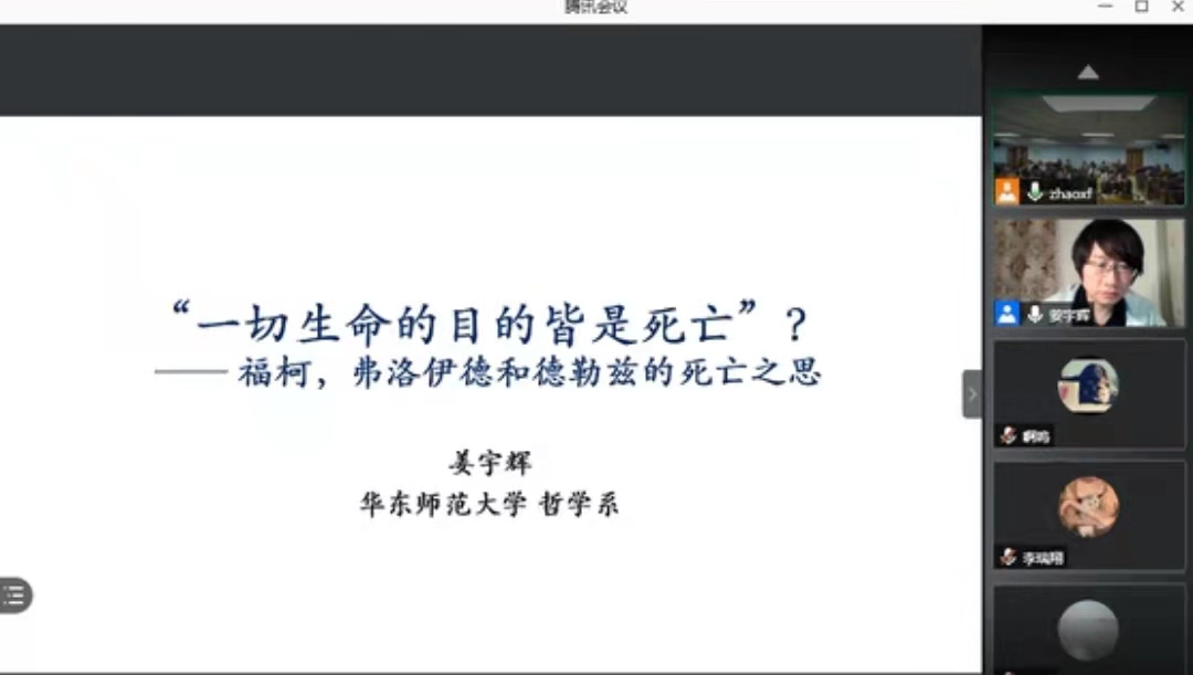 2021年4月15日晚七点,“哲学社会学院名家系列讲座第117场”在腾讯会议上进行。本次讲座的主讲学者为中国法国哲学专业委员会理事、上海市曙光学者、华东师范大学哲学系博士生导师姜宇辉教授。姜宇辉教授以“‘一切生命的目的皆是死亡?’——弗洛伊德、福柯与德勒兹的死亡之思”为题为广大师生带来了精彩的讲座。本次讲座以线上结合线下的方式进行,赵雄峰老师主持了本次讲座。