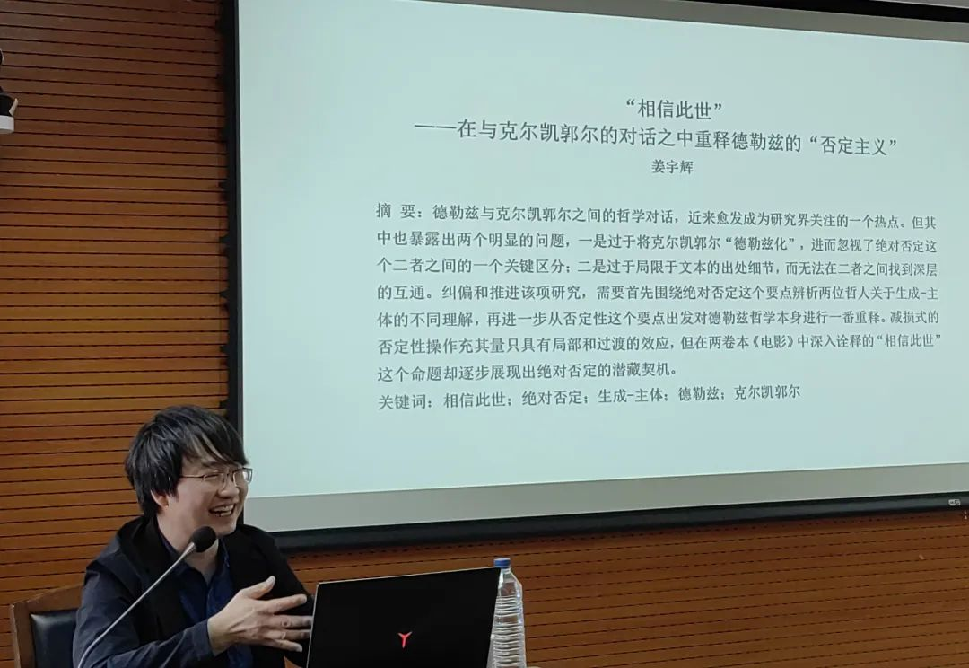 2023年9月21日下午,吉林大学哲学社会学院举办的德法哲学青年学者系列讲座第五讲在东荣大厦904举办。本期讲座由华东师范大学政治与国际关系学院的姜宇辉教授主讲,讲座主题为“从梦机器到暗主体 —— 电影与电子游戏之间的否定性之思”。吉林大学哲学社会学院王福生教授、吉林大学哲学社会学院李龙教授担任与谈人和评论人,外国哲学教研室郝鸿军主任、吉林大学新闻与传播学院王健副教授、吉林大学哲学社会学院盛传捷副教授列席了本次讲座。讲座由赵雄峰副教授主持。