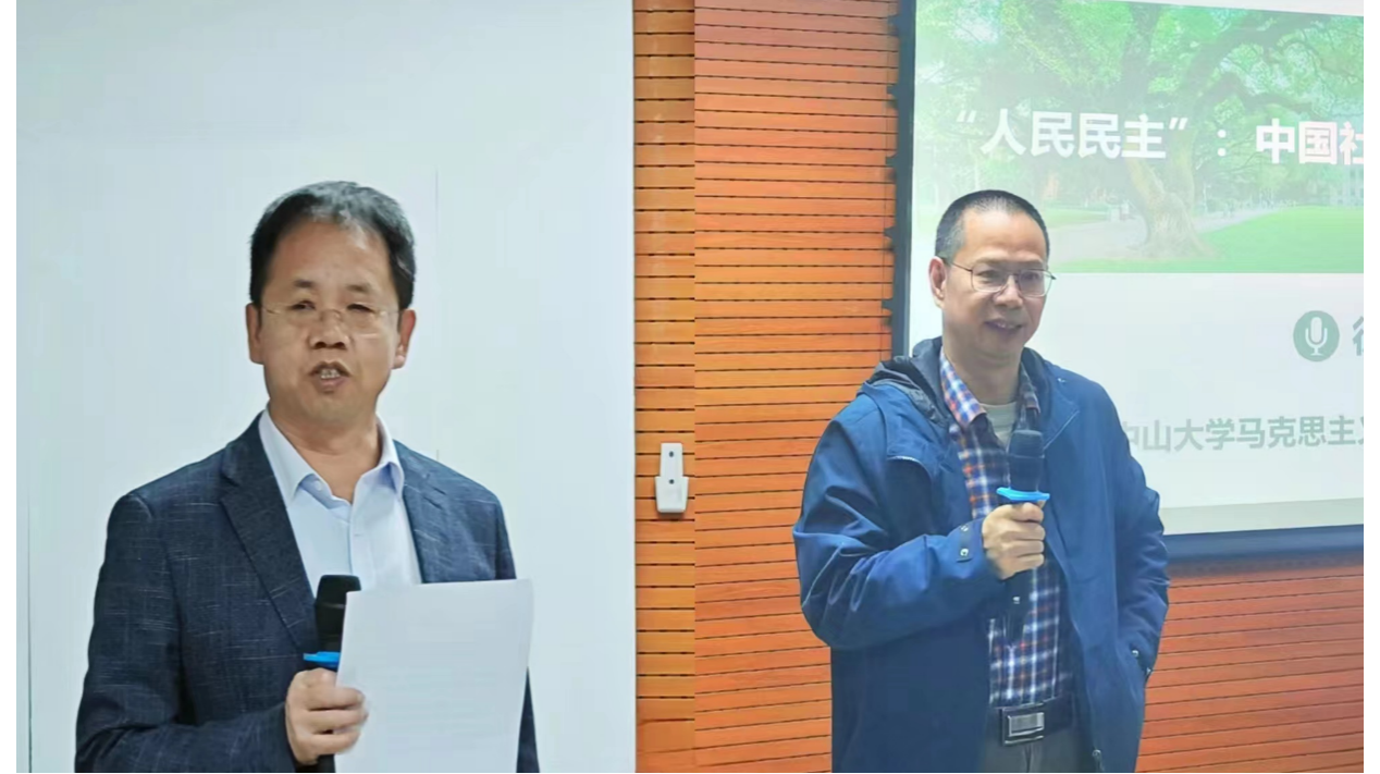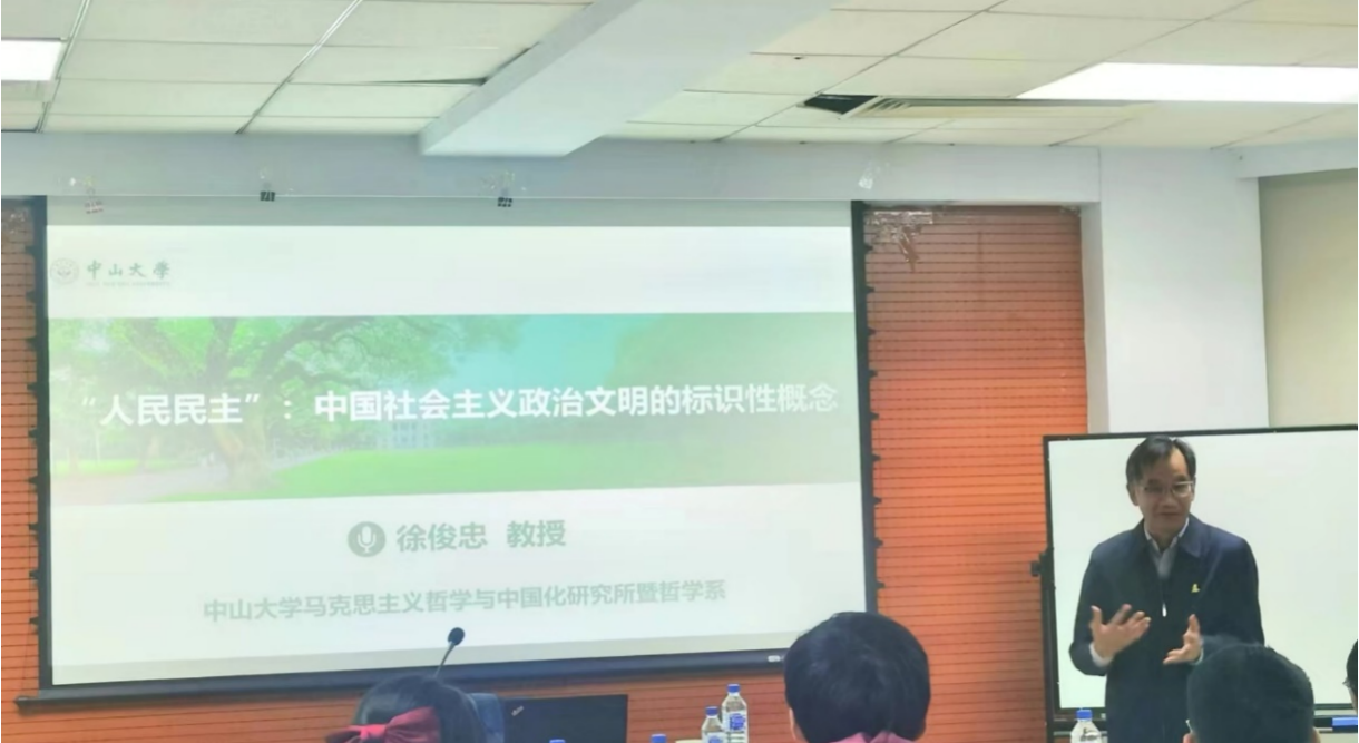 2023年10月15日晚,吉林大学哲学社会学院名家系列讲座第195场在东荣大厦A904会议室举办。主讲人为中山大学马克思主义哲学与中国现代化研究所暨哲学系教授、中山大学博物馆(校史馆)馆长徐俊忠教授,讲座主题为“人民民主:中国社会主义政治文明的标识性概念”。吉林大学哲学基础理论研究中心副主任贺来教授担任与谈嘉宾,本场讲座由吉林大学哲学社会学院院长白刚教授主持。