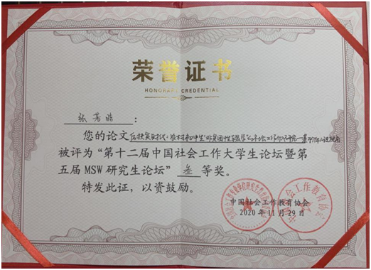 近日,由全国社会工作专业学位研究生教育指导委员会、中国社会工作教育协会联合主办,江西财经大学承办的“第十二届中国社会工作大学生论坛暨第五届研究生论坛”落下帷幕。我院2018级社会工作专业本科生张若晗荣获全国三等奖。