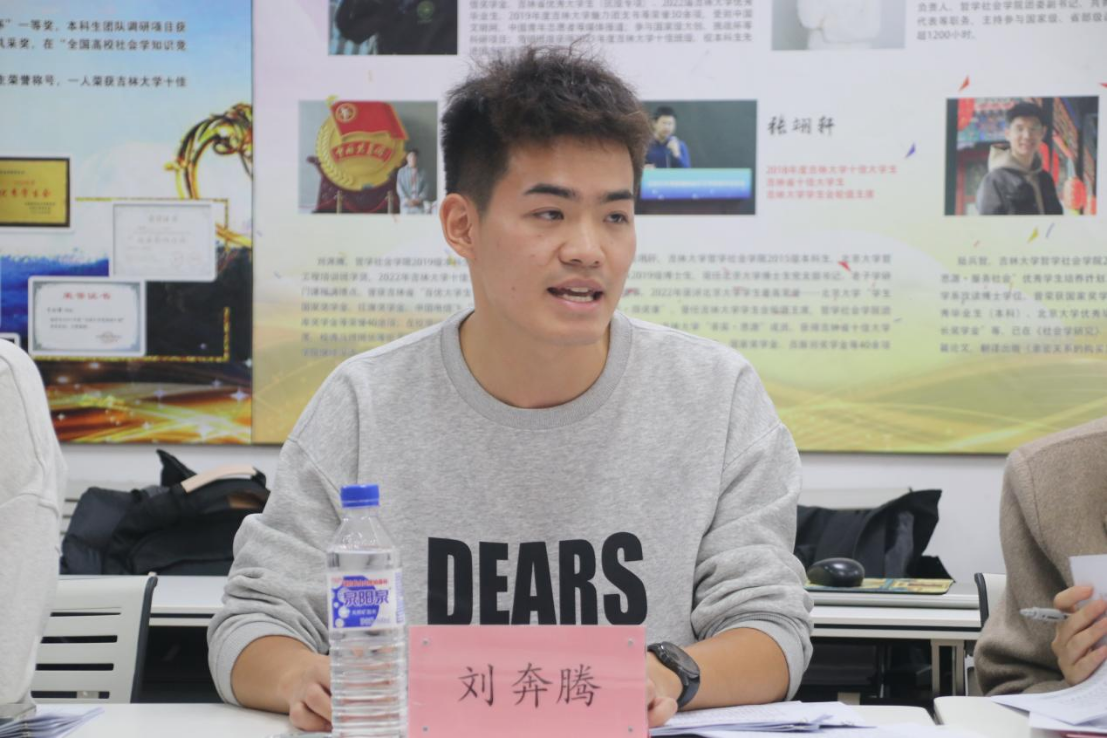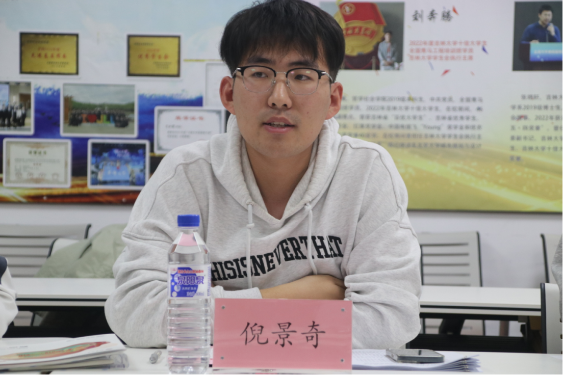 在几位老师的介绍过后,出席本次会议的“四院”学生代表北京大学城市规划与设计学院研究生党支部书记刘奔腾,全国青马学员、吉林大学学生会主席、哲学社会学院20级本科生李慧婷,石河子大学文学艺术学院学生会主席庞怡婷,吉林大学第二十五届研究生支教团团长倪景奇分别就各自学院的基本情况进行介绍,并提出相关建议。