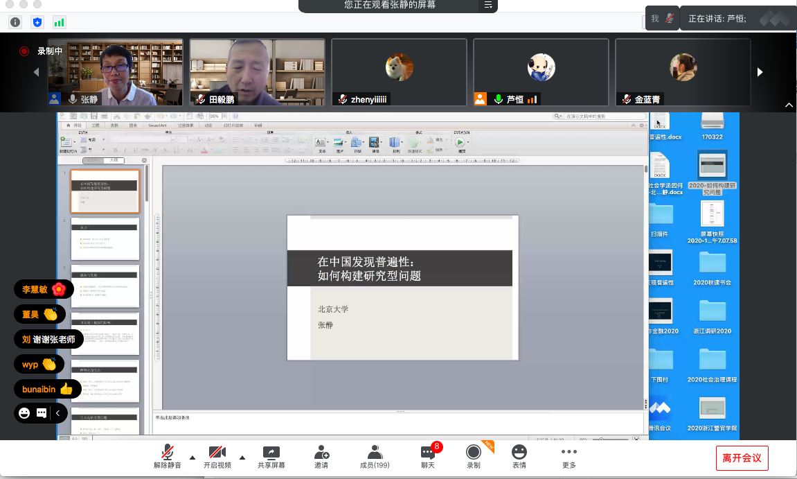 2020年12月4日上午10:00,哲学社会学院第115场名家讲座通过腾讯会议的形式在线上举办。北京大学社会科学学部主任、北京大学社会学教授、博士生导师张静教授,作了题为《如何提问·在中国发现普遍性:如何建构研究型问题》学术讲座。田毅鹏院长致开场词。