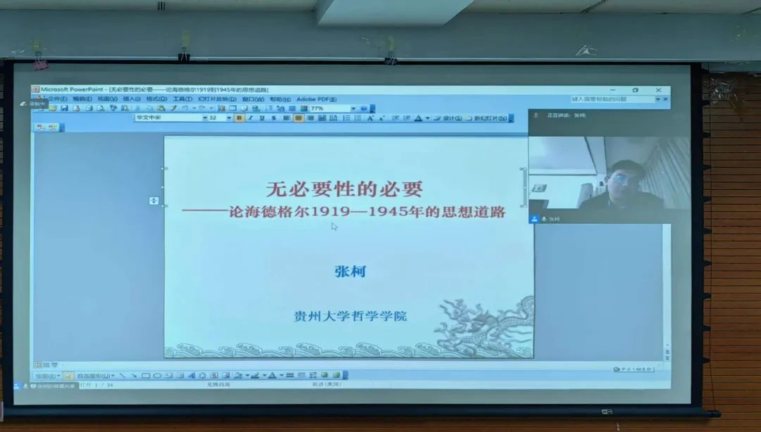 2023年10月18日晚上,吉林大学哲学社会学院举办的德法哲学青年学者系列讲座第七讲在东荣大厦904举办。本期讲座由贵州大学哲学系张柯教授主讲,讲座主题为“无必要性的必要一一论海德格尔1919-1945年的思想道路”。同济大学人文学院张振华副教授担任与谈人和评论人。讲座由赵雄峰副教授主持。