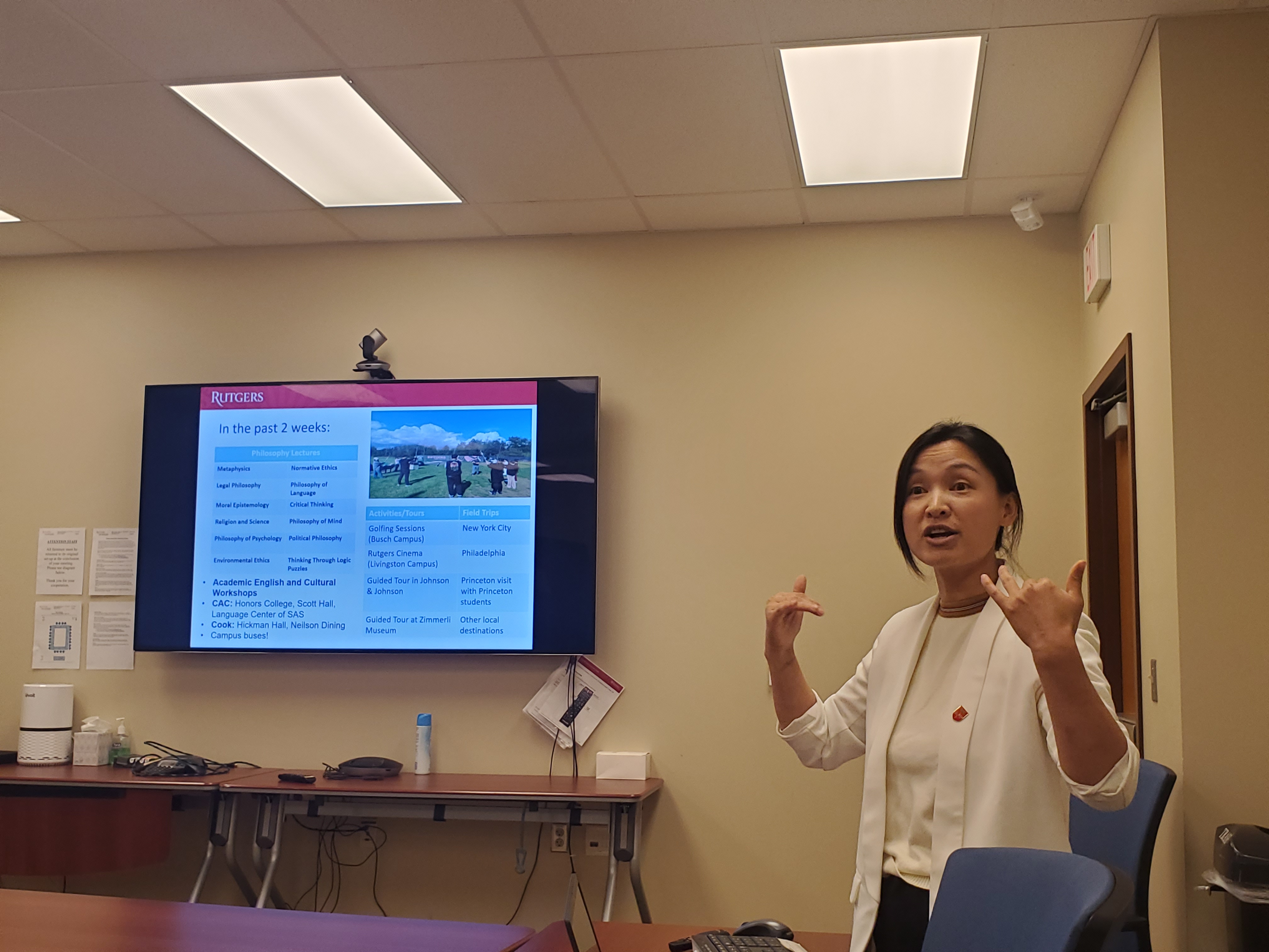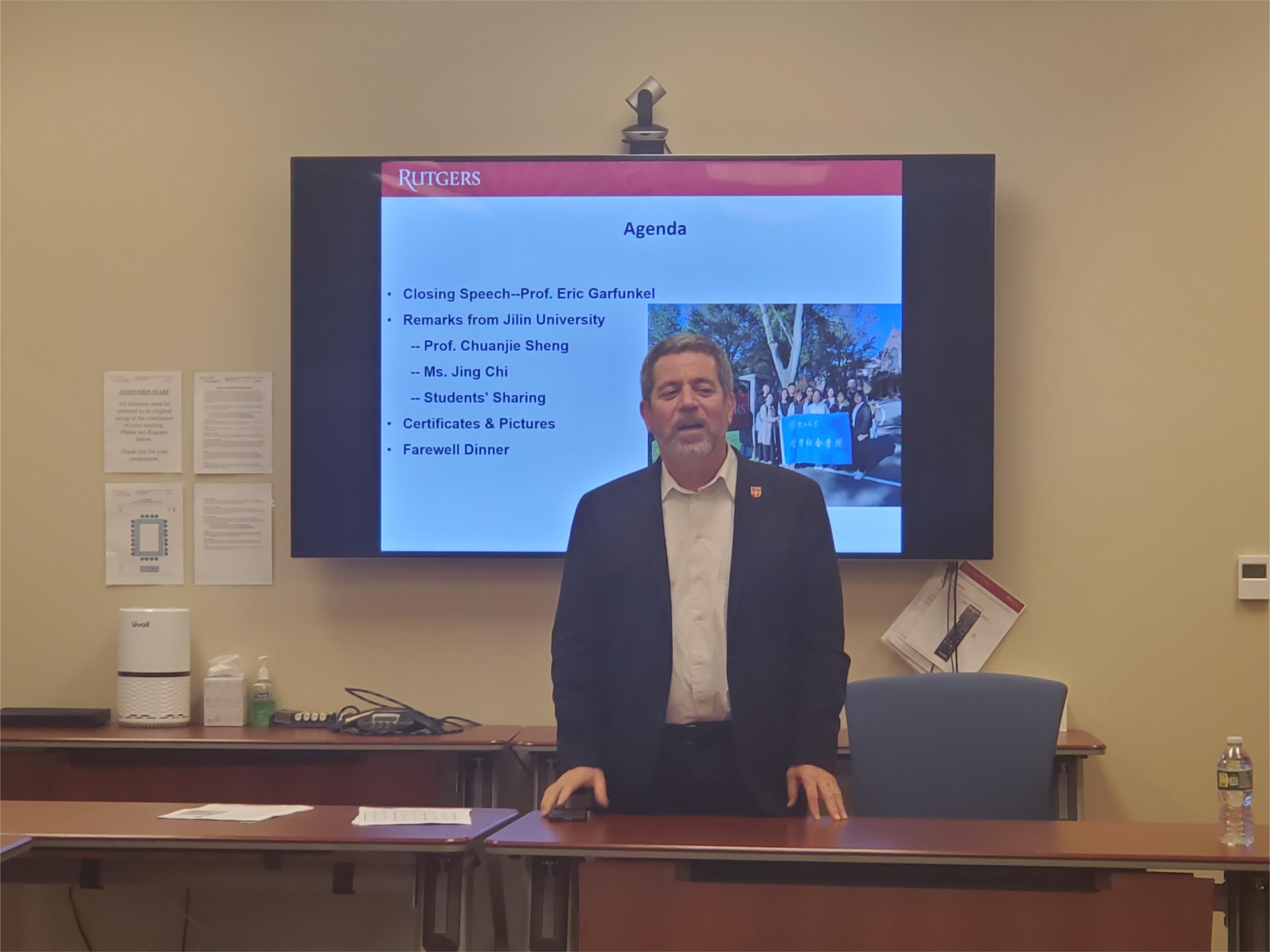 然后,吉林大学哲学社会学院的盛传捷副教授分享了自己两周的感受,表达了对于罗格斯大学的感谢,希望两校的友谊可以进一步发展,罗格斯大学的同学可以来吉林大学进行交流学习。吉林大学教务处的迟晶老师也对罗格斯大学的师生表达了感谢,回忆了曾经与罗格斯大学的点滴瞬间,希望两校可以进一步交流合作,邀请罗格斯大学的老师同学来中国交流学习。林乐萱也代表同学们分享了自己的感受,在罗格斯大学感受到了不同的文化,学习到了多样的知识,表达了对罗格斯大学的感谢。