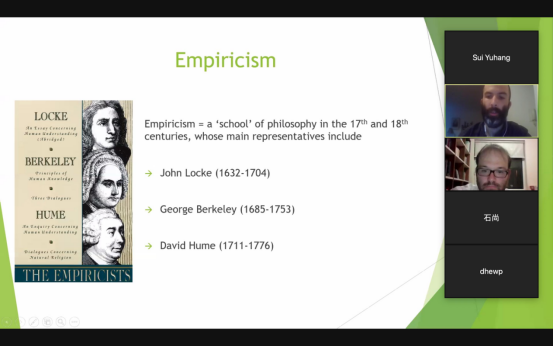 2020年11月5日至18日,美国爱纳大学Galen Barry助理教授为我院师生提供了5期线上课程,课程主题为Hume’s Empiricism and Skepticism(休谟的经验主义和怀疑论)。院内外师生踊跃参加。