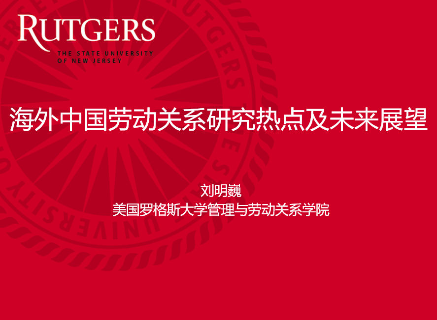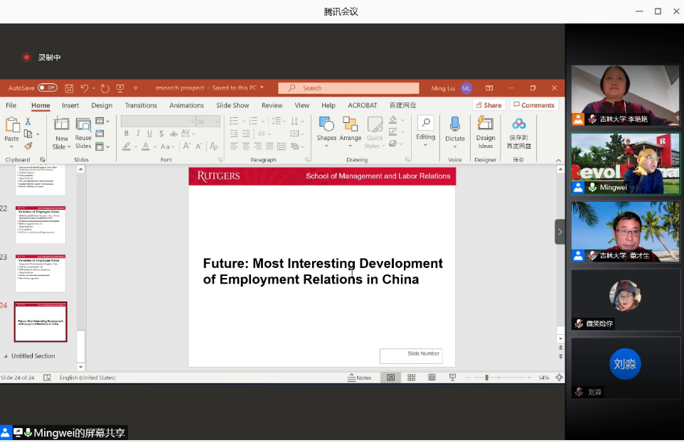 2020年10月31日晚7:30,吉林大学哲学社会学院名家讲座第109场以腾讯会议的方式举行。美国罗格斯大学管理与劳动关系学院终身副教授、罗格斯-中国人民大学全球工作与雇佣中心主任刘明巍做了题为“海外中国劳动关系研究热点及未来展望”的学术讲座。本场讲座是劳动关系系列讲座第五场,由哲学社会学院劳动与社会保障系劳动关系教研室主任李艳艳副教授主持。