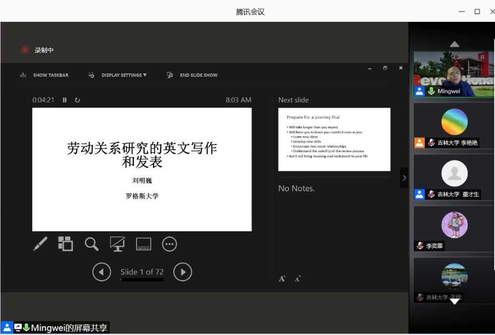 2020年10月28日晚8:00,吉林大学哲学社会学院名家讲座第107场以腾讯会议的方式举行。美国罗格斯大学管理与劳动关系学院终身副教授、罗格斯-中国人民大学全球工作与雇佣中心主任刘明巍做了题为“劳动关系研究的英文写作和发表”的学术讲座。本场讲座是劳动关系系列讲座第四场,由哲学社会学院劳动与社会保障系劳动关系教研室主任李艳艳副教授主持。