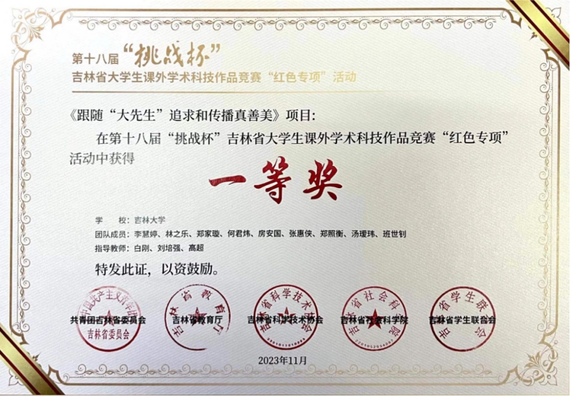 近日,共青团吉林省委下发了关于第十八届“挑战杯”吉林省大学生课外学术科技作品竞赛红色专项活动的通知,我院《跟随“大先生”追求和传播真善美》项目获得吉林省一等奖。