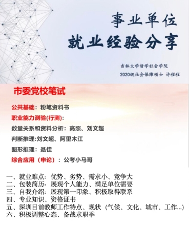 本次分享会邀请了许程程、罗宇超、贾云乾三位2023届硕士毕业生做求职经验分享,三位毕业生目前分别就职于吉林大学校友和基金工作办公室、深圳市第二高级中学以及运城市委党校。