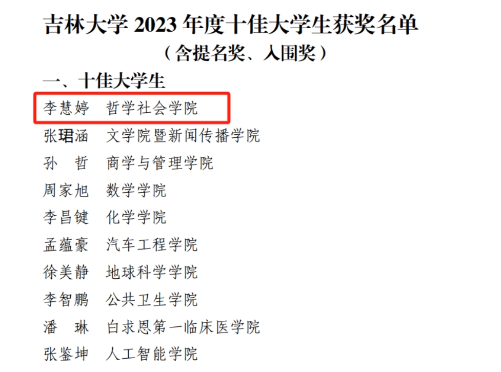 同时,2020级哲学1班荣获吉林大学2023年度十佳班级入围奖;2020级社会学专业本科生魏向南同学荣获吉林大学2023年度自强自立大学生入围奖。