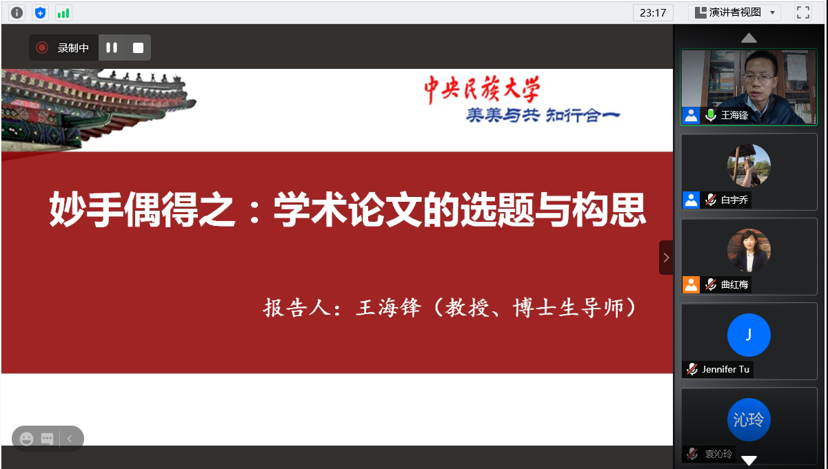 2020年11月10日18时,“2020年吉林大学哲学社会学院学术教育提升工程”第八讲以腾讯会议的形式进行。此次讲座由吉林大学曲红梅教授主持,中央民族大学王海锋教授主讲。讲座的题目为《妙手偶得之:学术论文的选题与构思》。