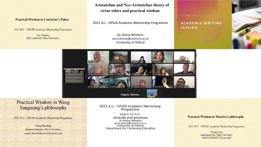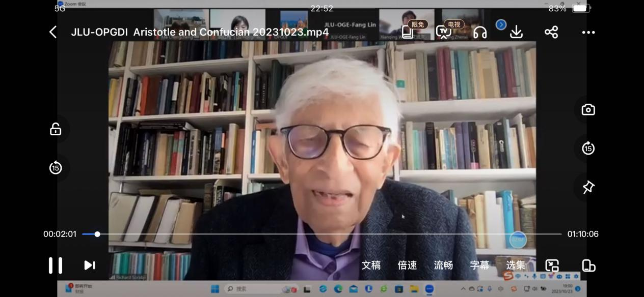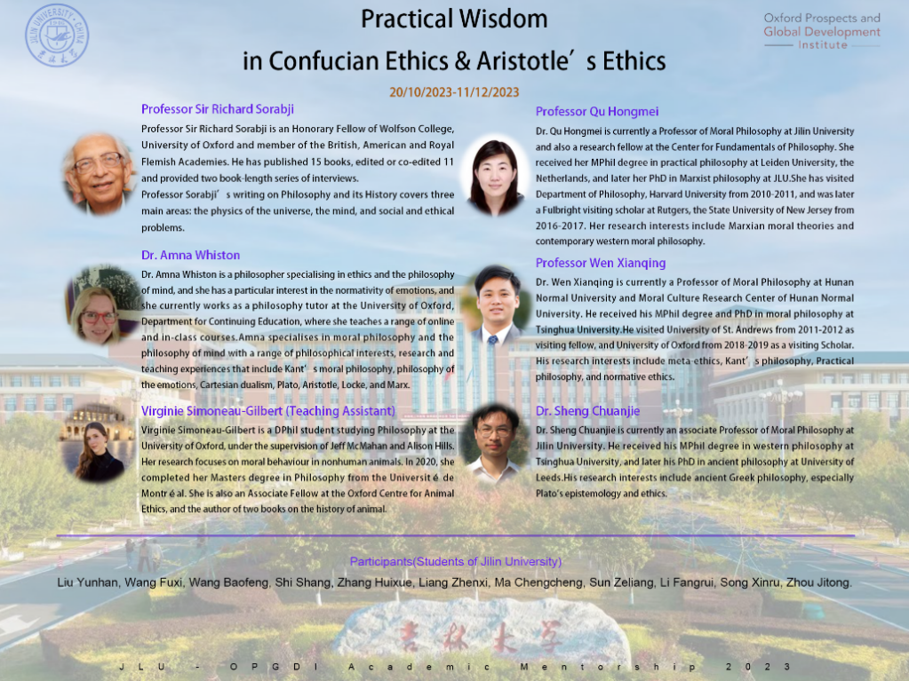 为发展哲学一流学科,培养具备宽广国际视野、突出学术能力的高素质人才,在国际合作与交流处“吉林大学—牛津大学学术合作伙伴计划”项目的大力支持下,哲学社会学院曲红梅教授团队特别邀请湖南师范大学文贤庆教授、哲学社会学院盛传捷副教授于2023年10月至12月间与英国国家学术院院士、牛津大学教授Richard Sorabji和牛津大学讲师Amna Whiston等学者开展系列线上座谈会议,部分哲学社会学院本科生受邀参加。