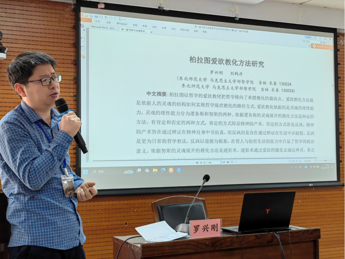 第二位发言人罗兴刚副教授的报告题目是《柏拉图的爱欲教化方法初探》。罗老师指出,柏拉图以哲学的爱欲教化把哲学推向了希腊教化的最高点。爱欲教化方法就是依据人的灵魂的结构如何实现哲学现世教化的路径方式。爱欲教化依据的是灵魂的理性能力,灵魂的理性能力分为逻各斯和努斯的两种。