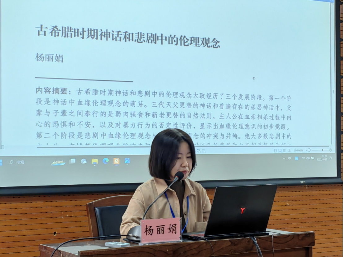 第二位发言人杨丽娟教授的报告题目是《古希腊时期神话和悲剧中的伦理观念》。杨老师指出,古希腊时期神话和悲剧中的伦理观念大致经历了三个发展阶段:第一个阶段是神话中血缘伦理观念的萌芽,第二个阶段是悲剧中血缘伦理观念与城邦伦理观念的冲突与并峙,第三个阶段是以悲剧《俄狄浦斯王》为代表的伦理观念的深化和成熟。