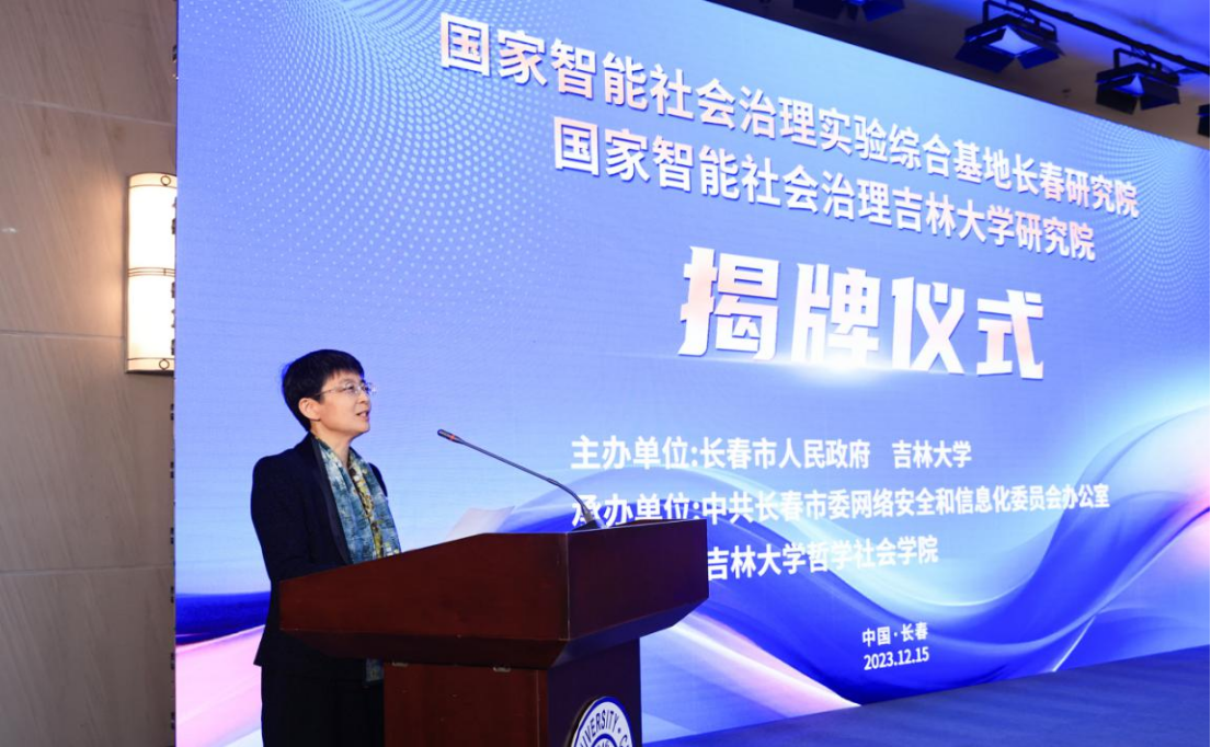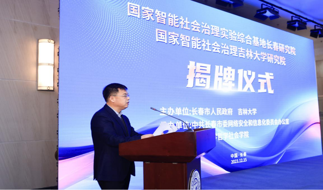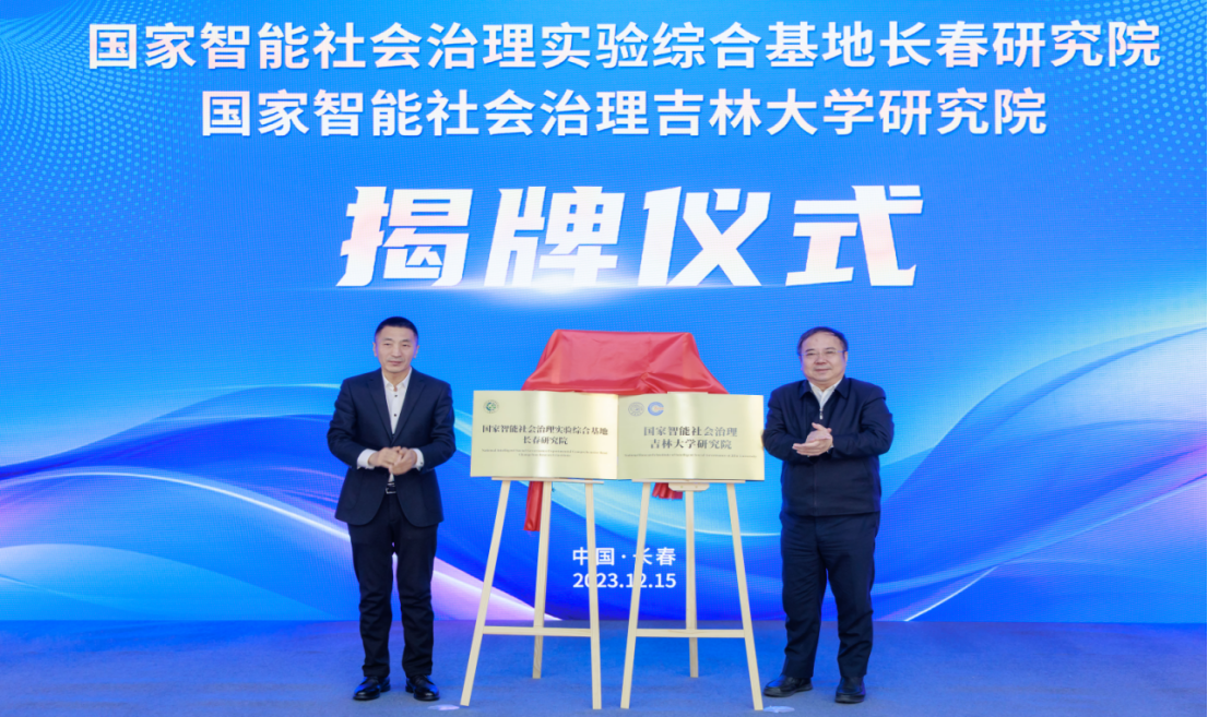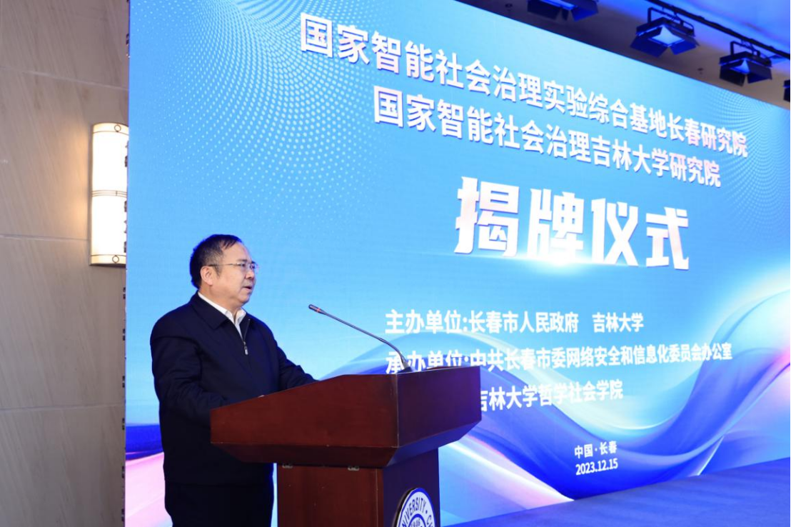 为深入贯彻落实习近平总书记关于网络强国的重要思想,开展人工智能社会实验、加快新一代人工智能技术与社会治理的深度融合,提升社会治理体系效能,长春市委市政府统筹规划、顶层设计,与吉林大学有效协同、精诚合作,共同成立了国家智能社会治理实验综合基地长春研究院、国家智能社会治理吉林大学研究院。2023年12月15日上午,两所研究院在吉林大学举行揭牌仪式。吉林省委宣传部副部长、省委网信办主任王颖,长春市委副书记、宣传部部长赵明,吉林大学党委副书记韩喜平,长春市委网络安全与信息化办公室主任宋学兵,吉林大学社会科学研究院院长曲红梅教授,吉林大学哲学社会学院党委书记张晓萌,院长白刚教授等人参加活动。揭牌仪式由长春市政府副秘书长王文元主持。
