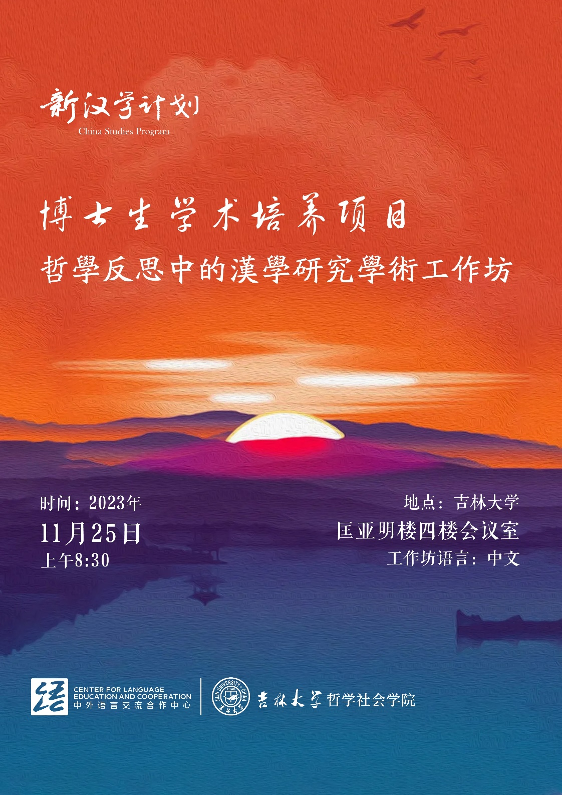 2023年11月25日,由教育部中外语言交流合作中心与吉林大学哲学社会学院共同举办的“新汉学计划”博士生学术培养项目“哲学反思中的汉学研究”学术工作坊在吉林大学匡亚明楼四楼会议室举行。此次工作坊邀请到了北京第二外国语学院的刘燕教授、天津外国语大学的蔡觉敏副教授、山东大学的李玮皓副教授、吉林大学的达奇(Ignacio Ramos Riera)副教授等相关研究领域专家,来自北京大学的伊豆原英悟(Izuhara Eigo)、山东大学的美凌(Enkhtaivan Khulan)两位“新汉学计划”博士研究生和来自黑龙江大学的许雁、吉林大学的焦玉等多位研究生与本科生参加了此次学术工作坊。