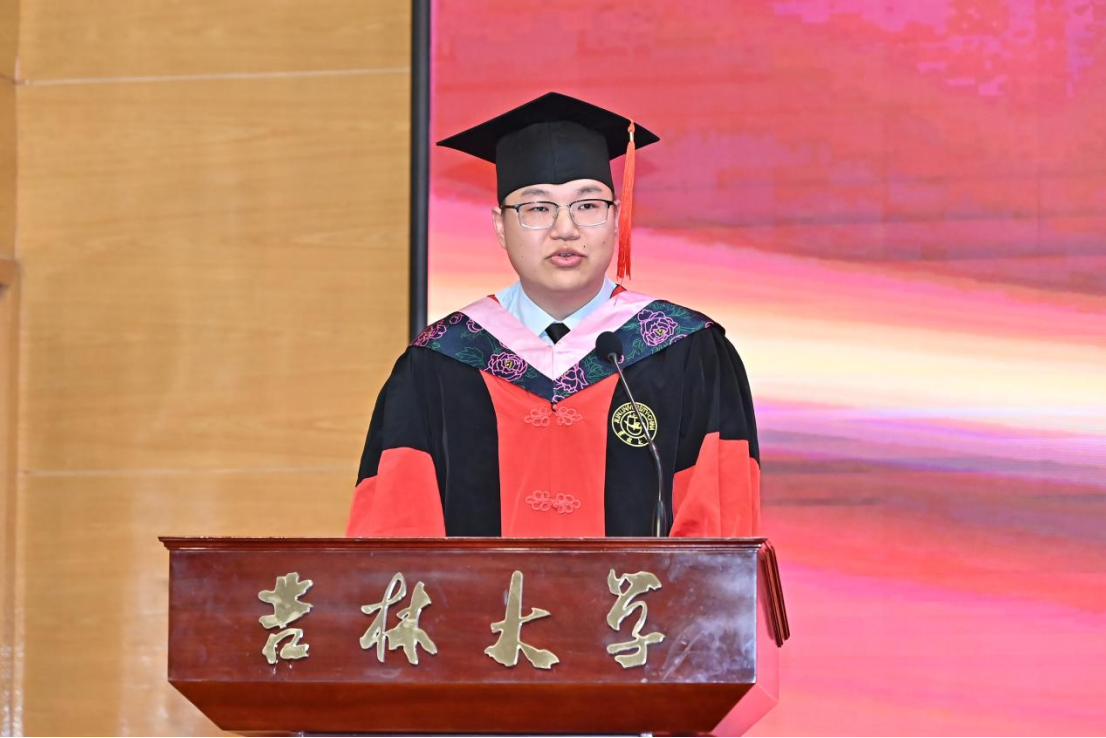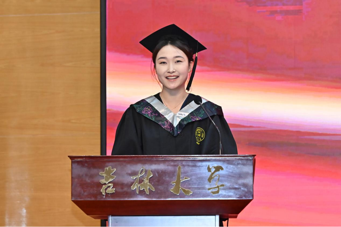 典礼第八项,学院毕业本科生代表,2023年度吉林大学十佳大学生、最美女大学生获得者,2020级劳动与社会保障专业李慧婷发言。她向曾经一路相伴成长、相向奔赴的师长们、亲友们,表达了最真诚的谢意,并回顾了自身沿着初入吉大的旅途一路走来的点点滴滴。她提到,正是学院“为人为学,其道一也”的思想精神、“人比山高,脚比路长”的具体践行浸润了我们的心灵、成就了我们的品格。哲社是每一个你我,哲社成就了我们,我们也共同成为了哲社,无论以后身处何方,愿同学们一起携手努力把“哲学社会学院的理想”变成“理想的哲学社会学院”!