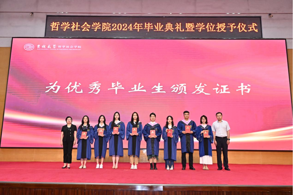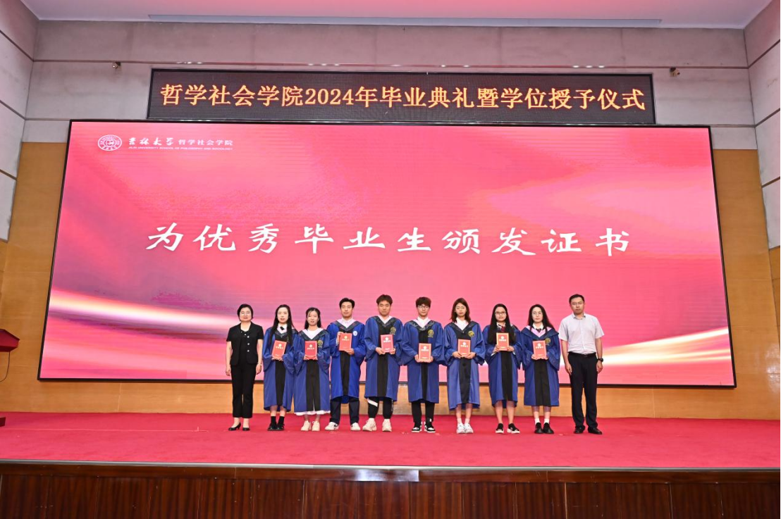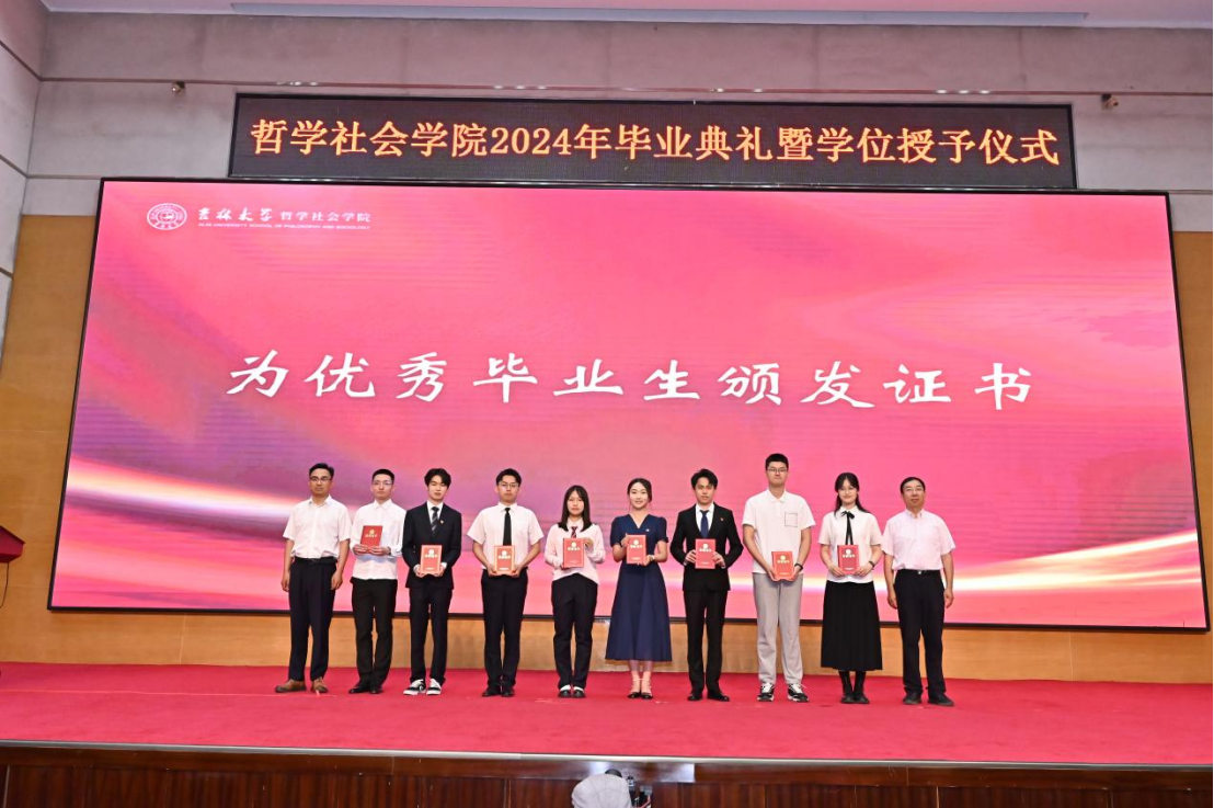 典礼第三项,党委副书记、纪委书记赵洁,基础理论研究中心副主任李生琦为研究生优秀毕业生颁发证书;副院长朱文君,副院长李龙为本科生优秀毕业生颁发证书。主席台上,学院老师们与同学们握手合照,手与手之间的相握,不仅是知识技能的传递,更象征着哲社优秀学术传统与思想精神的代际传承,如今又一届哲社学子将接过时代使命的“接力棒”、踏上求真寻道的“长征路”,愿他们能将哲社精神融入思想与实践之中,汲取力量、砥砺前行!