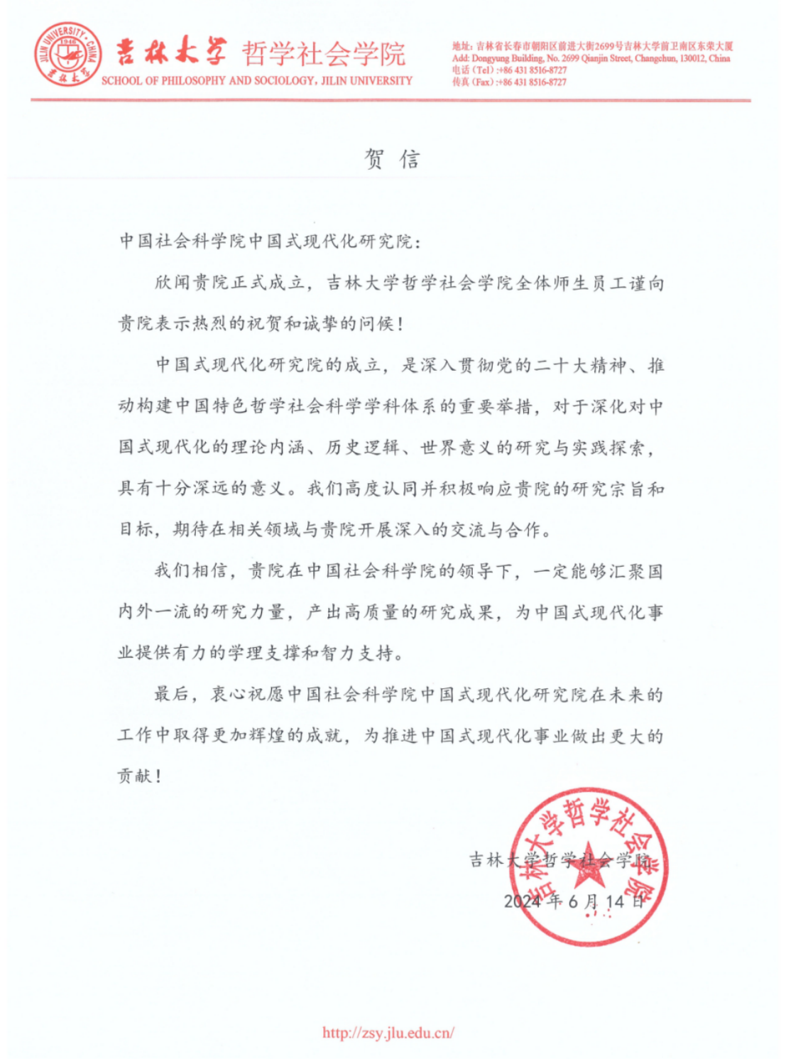 此外,吉林大学哲学社会学院、东北振兴发展研究院以及东亚社会学会对中国式现代化研究院成立分别发贺信祝贺 ,预祝中国式现代化研究院继续发挥理论研究、实践探索、人才培养等方面的积极作用,为中国式现代化的全面推进和中华民族的伟大复兴贡献力量。