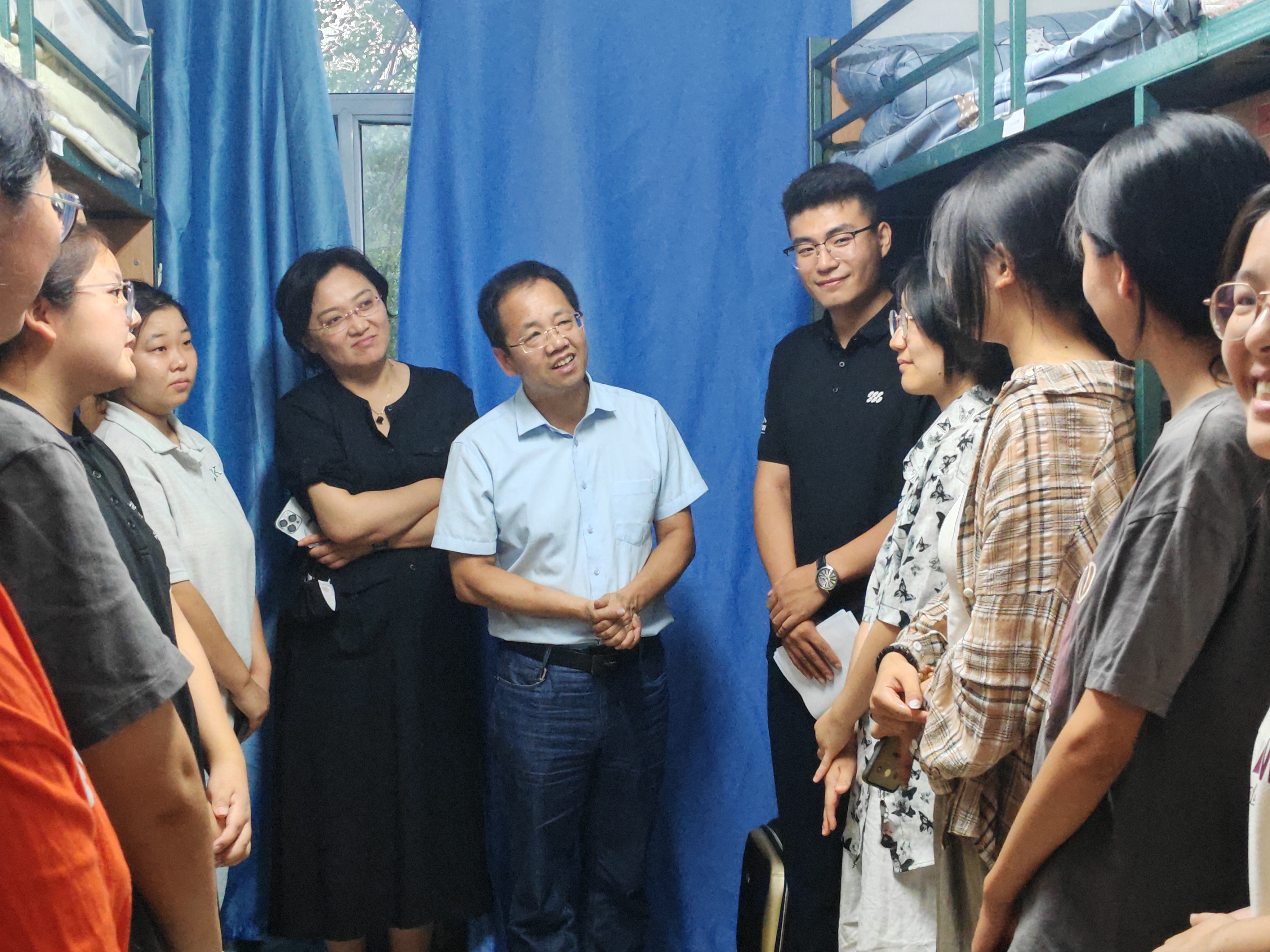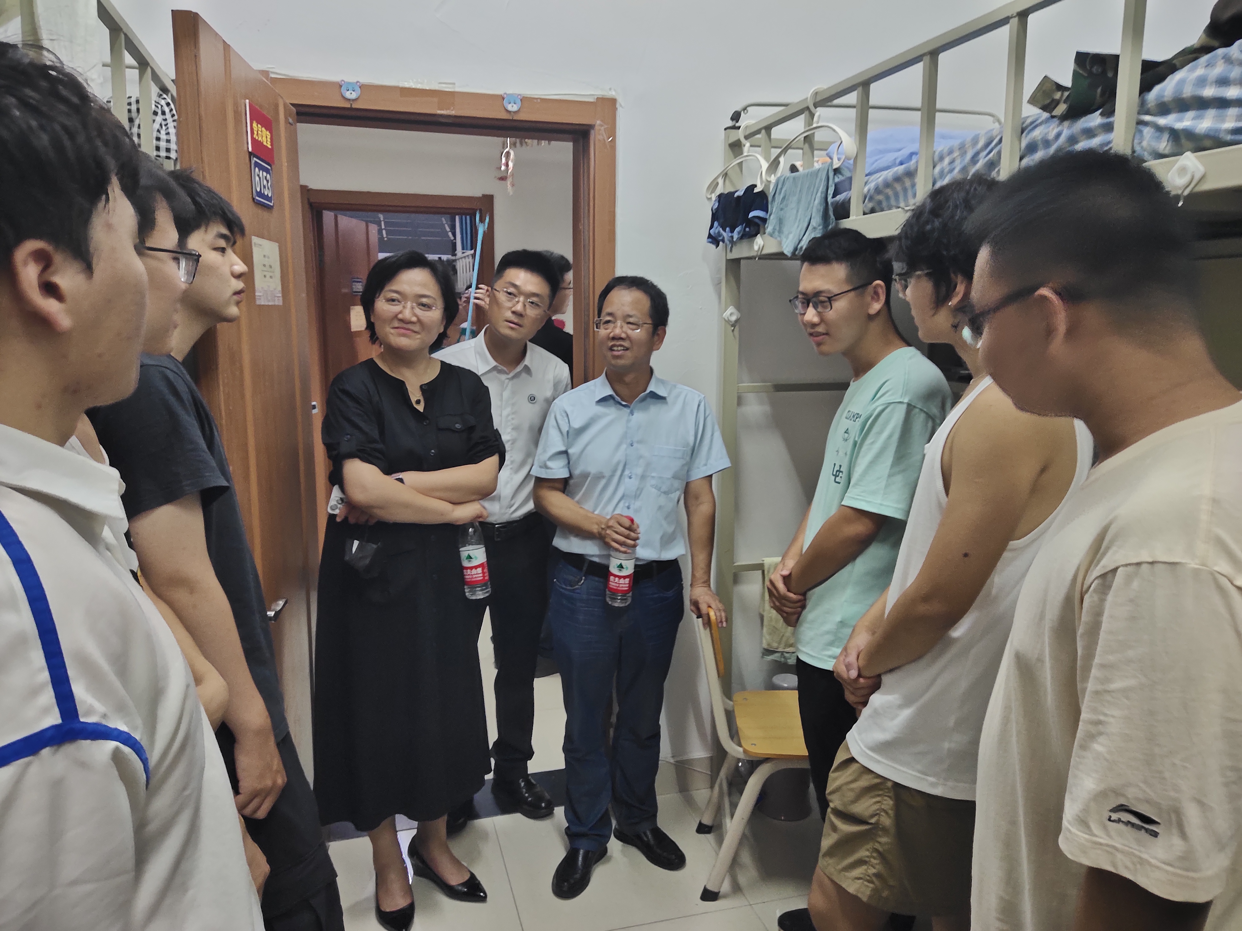 为深入了解2024级本科新生情况,帮助同学们尽快适应大学的学习生活,传递学院的关心关怀,8月26日晚,院长白刚、党委书记张晓萌,党委副书记兼副院长刘培强以及学院学生工作办公室全体老师和辅导员助理同学们共同来到本科新生宿舍,走访看望新生。
