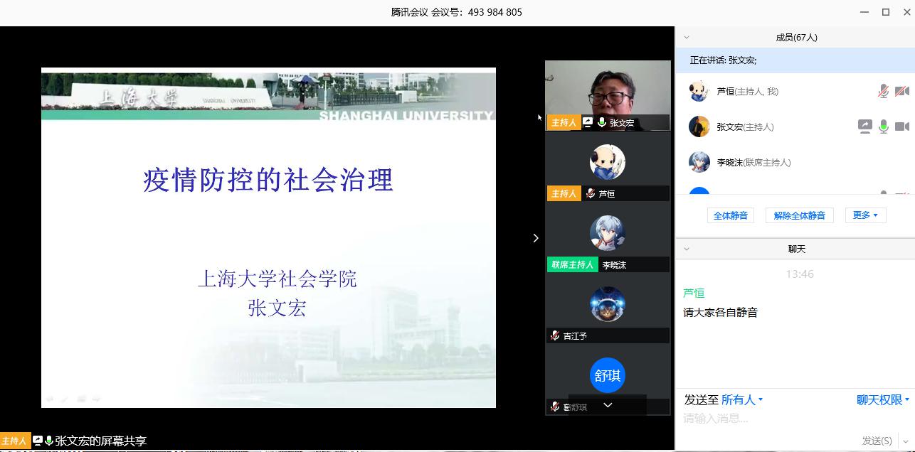 2020年4月17日下午14:00,哲学社会学院第82场名家讲座通过腾讯会议的形式在线上举办。上海大学社会学院院长、教授、博士生导师张文宏教授,为线上八十余名师生作了题为《疫情防控的社会治理》的学术讲座。哲学社会学院副院长芦恒教授主持本场讲座。