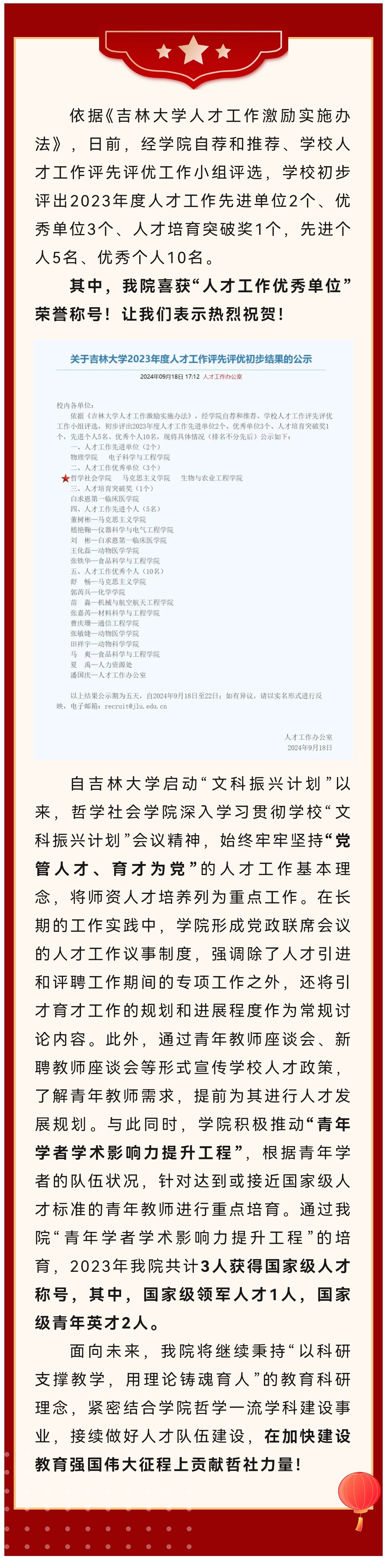 喜报 | 我院在吉林大学2023年度人才工作评先评优工作中喜获“人才工作优秀单位”荣誉称号!