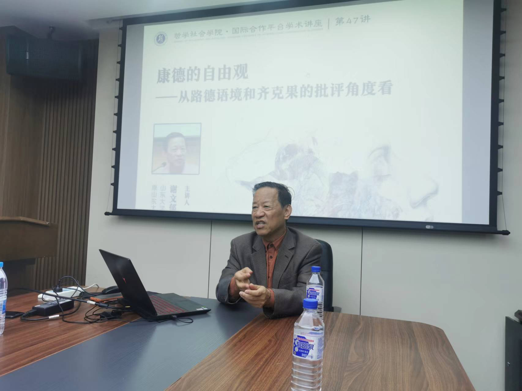 2024年9月29日9时,吉林大学哲学社会学院“国际合作平台学术讲座”第47讲——“康德的自由观——从路德语境和齐克果的批评角度看”在东荣大厦908会议室举办。本期讲座由山东大学哲学系谢文郁教授主讲,讲座由盛传捷副教授主持。中山大学哲学系江璐副教授、吉林大学哲学社会学院赵雄峰副教授参加了此次讲座。
