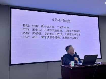 邴正教授从“追随大师,才能超越自我”“潮头弄棹,才能风光无限”和“根治大地,才能枝繁叶茂”等三个方面展开介绍。首先,邴正教授从七七年高考谈起。“七七级”被视为一个时代的神话,在吉林大学哲学专业中,这一批学生与高清海、舒炜光、邹化政等大师同行,向大师们学习精深苦读、笨想、有我、创新、包容和“治学为人,其道一也”的精神品格。然后,邴正教授结合自身的学术经历,介绍了不同阶段的学术研究重点和主要成绩,重点分享了自己的科研体会,特别提出在方法上要“笨想慎思寻逻辑,出新意于法度中”。最后,邴正教授结合自身的科研经历,总结宝贵的科研经验,与参会者分享。
