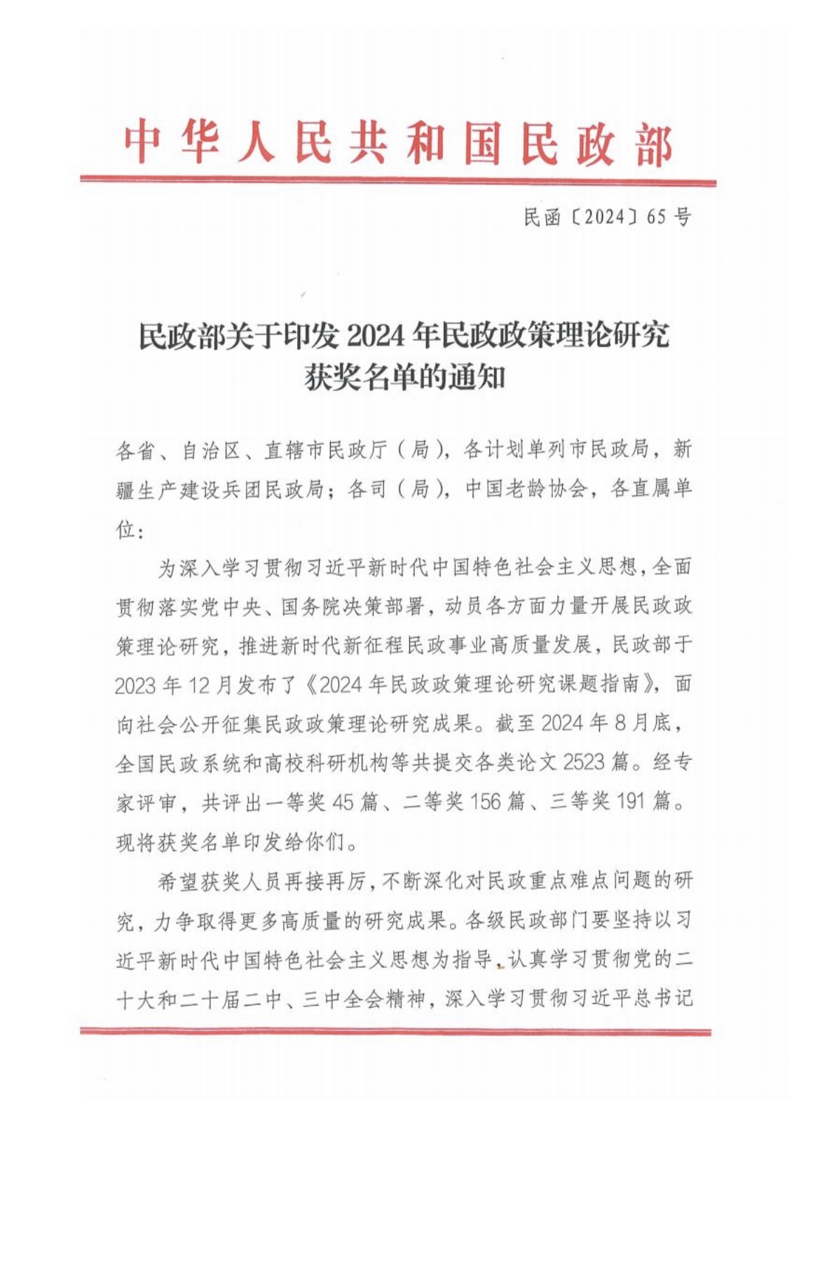 为深入学习贯彻习近平新时代中国特色社会主义思想,全面贯彻落实党中央、国务院决策部署,动员各方面力量开展民政政策理论研究,推进新时代新征程民政事业高质量发展,民政部于2023年12月发布了《2024年民政政策理论研究课题指南》,面向社会公开征集民政政策理论研究成果。本院学生积极参与此次活动。2024年11月1日,中华人民共和国民政部发布了关于印发2024年民政政策力量研究获奖名单的通知,吉林大学哲学社会学院2017级社会学专业博士研究生徐莉、成彦提交的文章《中国式现代化背景下现代公墓业发展路径研究》荣获三等奖。