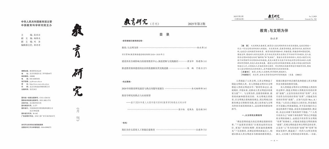 近日,2025年第2期《教育研究》刊发吉林大学哲学基础理论研究中心主任、哲学社会科学资深教授孙正聿所著《教育:与文明为伴》一文。