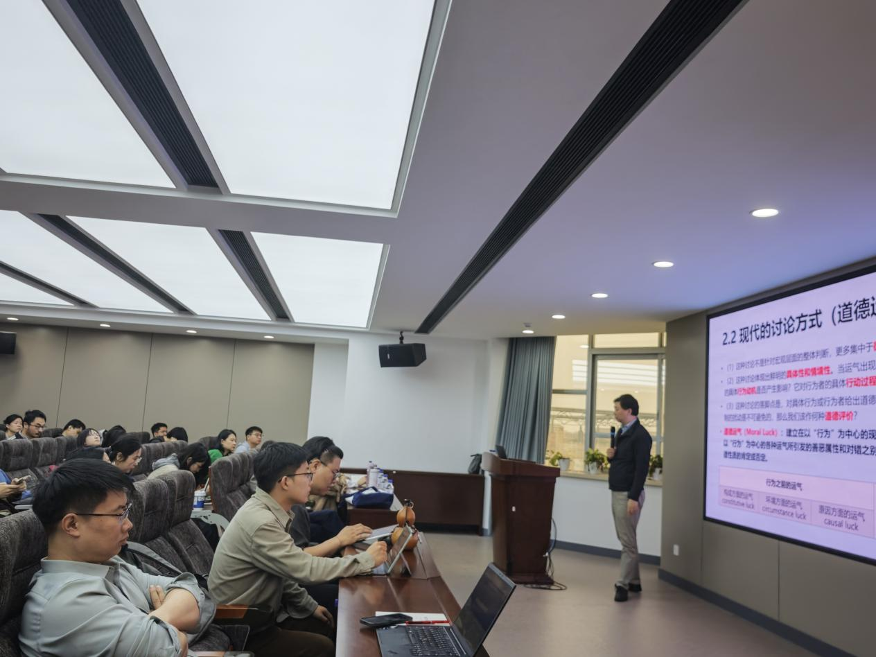 李义天教授以“偶然之外:在运气中理解伦理学”为题,通过对哲学史中运气问题的内涵、古典与现代哲学家对于运气问题讨论的方式、道德运气对主体能动性限度问题的揭示以及后果论者与动机论者对该问题的回应四个层面深入探讨了“道德运气”相关问题。