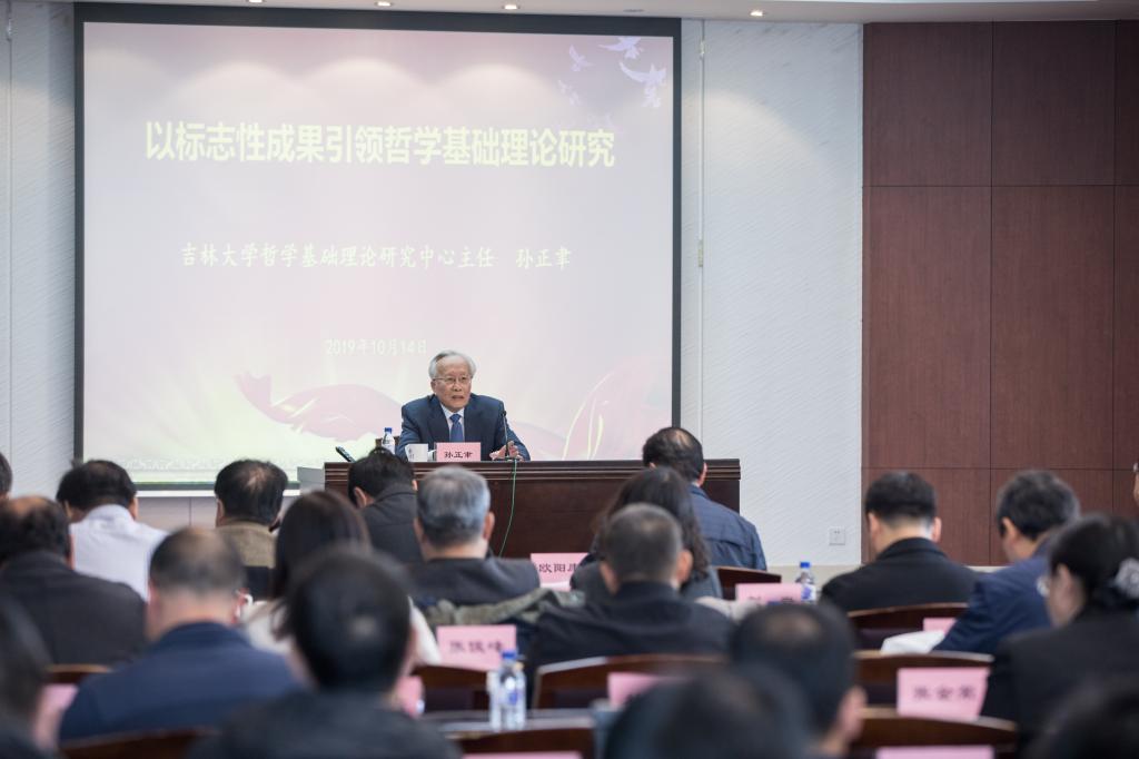 哲学基础理论研究中心主任孙正聿教授代表中心全体成员向长期以来关心和支持中心建设的教育部社科司、省委宣传部、兄弟院校的研究基地和学术刊物,向吉林大学党政领导和社会科学处、发展规划处等职能部门以及哲学社会学院的党政领导和全体教师、工作人员和同学们表示衷心的感谢,并作《以标志性成果引领哲学基础理论研究》的总结报告。报告从四个方面总结中心的建设经验和思考对中心的未来发展。