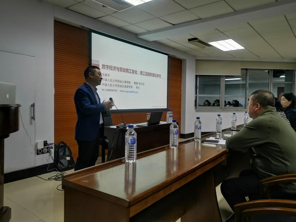 2019年10月10日晚6点,哲学社会学院第60场学术名家讲座在东荣大厦904会议室举行。中国人民大学劳动关系研究所所长、中国劳动经济学会劳动关系分会副会长、中国人力资源开发研究会劳动关系分会学术委员会主任、中国人民大学劳动关系系主任吴清军教授,作了题为“数字经济与劳动用工变化:用工实践和理论研究”的学术报告。