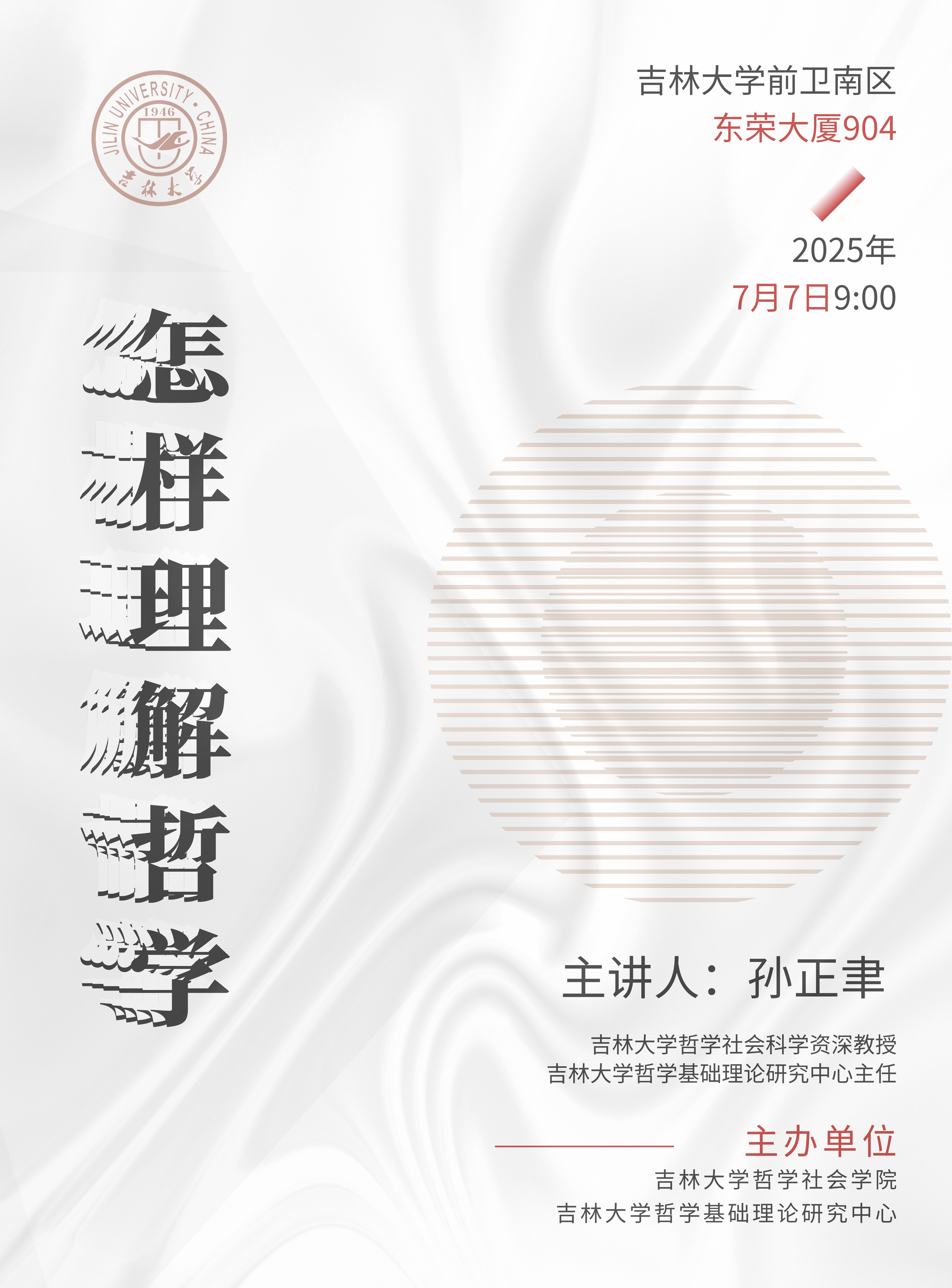 2025年7月7日上午9:00,在吉林大学中心校区东荣大厦904会议室,吉林大学哲学社会科学资深教授、吉林大学哲学基础理论研究中心主任孙正聿教授为参加“吉林大学2025年‘美道慎行’哲学校园学术活动开放日”活动的师生们,做了题为“怎样理解哲学——哲学是什么与怎样做哲学”的学术报告。