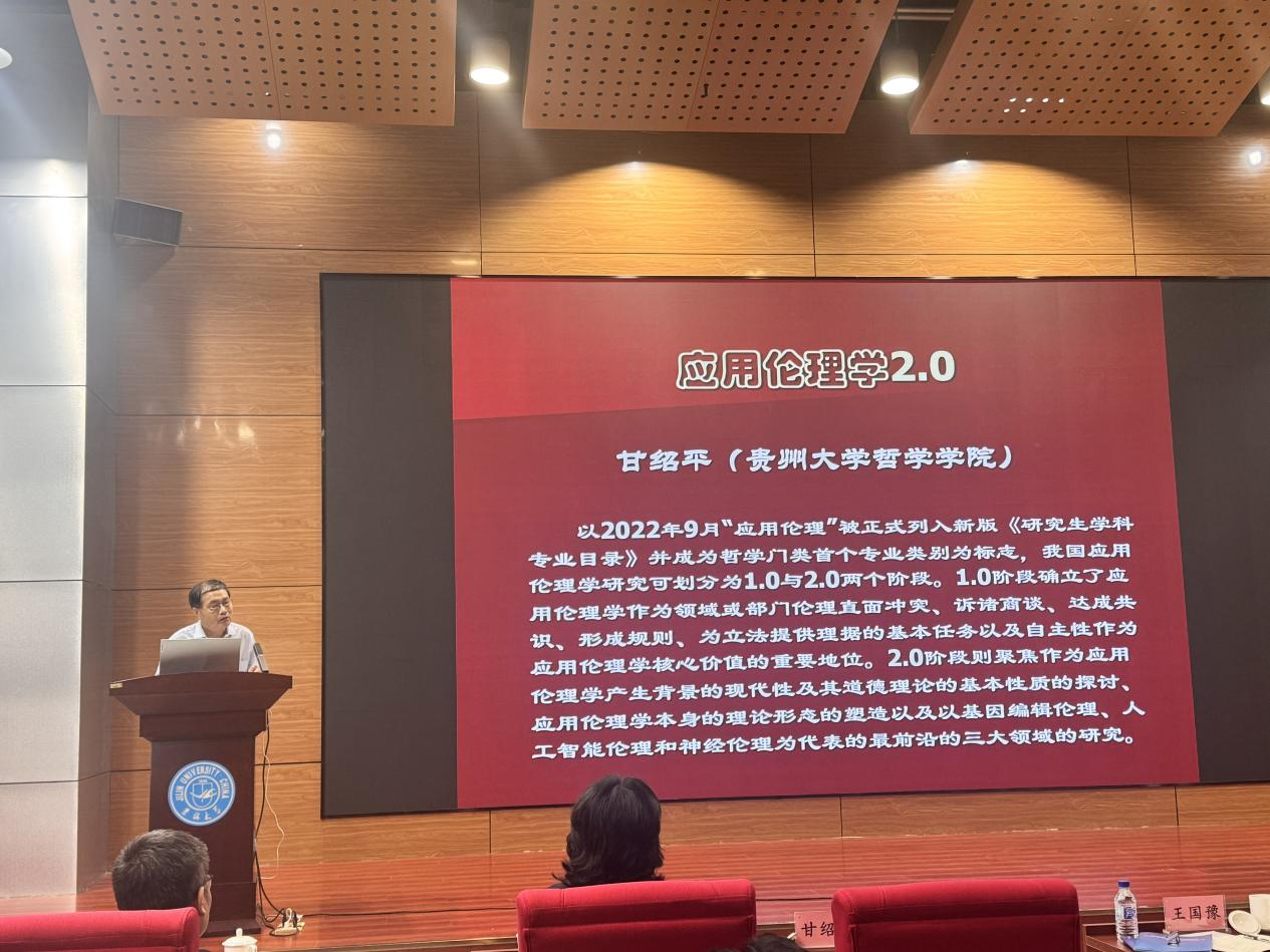 特邀报告环节由全国应用伦理专业学位研究生教指委委员、大连理工大学李伦教授主持,贵州大学甘绍平教授做“应用伦理学 2.0”的主旨报告。甘绍平教授介绍了应用伦理学在我国的发展历史,分析了应用伦理学的发展和现代性的关系,认为应用伦理学是一种共识伦理、原则伦理和程序伦理,并强调神经伦理、基因增强伦理和人工智能伦理是当前最前沿、最紧迫的伦理问题。在接下来的讨论环节,学者们针对应用伦理和应用伦理学之间的区别和联系,MAE的发展前景、MAE与哲学专业其他二级学科的关系、MAE与人类现实生活的关系等问题展开了深入讨论。