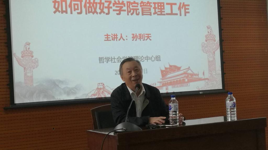 按照《哲学一流学科服务能力提升计划》和《哲学社会学院党委理论学习计划》要求,哲学社会学院于5月29日召开哲学一流学科服务能力提升计划系列讲座首场讲座暨哲学社会学院党委理论学习(扩大)会议。学院邀请“万人计划”国家级教学名师,哲学基础理论研究中心副主任孙利天教授为首场讲座主讲人,讲座题为“如何做好学院管理工作”。学院党政领导班子成员、系主任和全体管理工作人员、支部书记近三十人参加了本次活动,学院党委书记全华同志为讲座主持。
