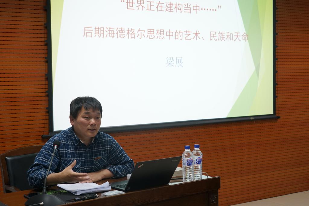 梁展老师针对海德格尔后期思想中的艺术、民族和天命展开讲解,讲座主要分成三个部分:一是海德格尔思想的转折——由基本的存在论转向存在的发生思想,梁展老师对海德格尔“大写的存在”进行追问,辨析存在与存在者的区别。二是艺术在海德格尔后期思想中的重要作用,艺术是海德格尔的存在发生思想中的奠基性的环节,海德格尔将艺术看成真理的自行设置,艺术是真理发生的必要方式。三是海德格尔思想中艺术、科学与德意志民族的使命,从个人和民族角度分析其关系。海德格尔希望能够发挥艺术的政治潜力,但是梁展老师也对海德格尔思想中的薄弱点进行了批判性反思。